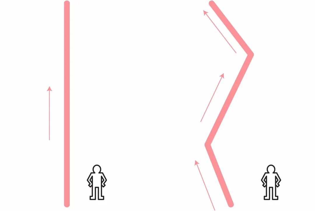 曲线型的屋顶给游人造成方向偏离与迷失感,而栈道的设计则很好地缓解了这种方向的不明确性,只让体验者感受到空间的柔和流动,激发探索未知的好奇心。