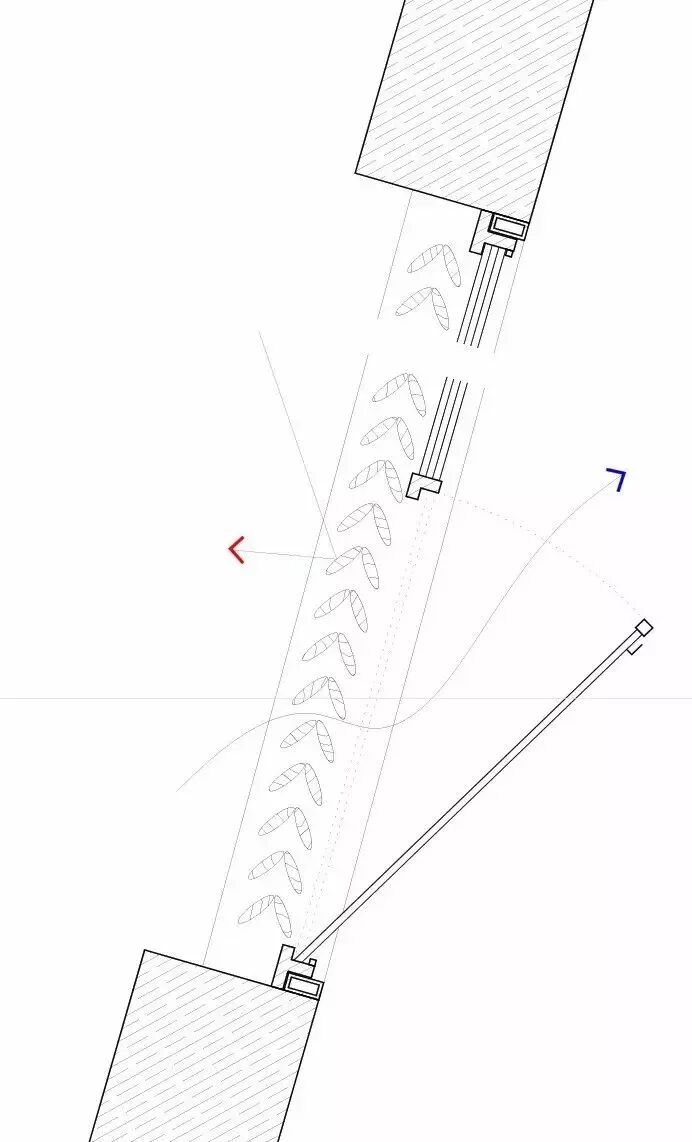 在表皮体系上,设计师从地形和太阳高度角为参考,曲线起伏强度和密度为因素,生成多种设计屋面形式,再生成根据屋面边线调整疏密及转动角度的90度夹角双层百叶立面体系,并最后综合多种因素决定最终建筑的形式。如此构造保证了通风阻光,自然风有利室内降温,而双层百叶则可实现对光的阻挡,与此同时,建筑的底部和两端再设置百叶窗进行通风。