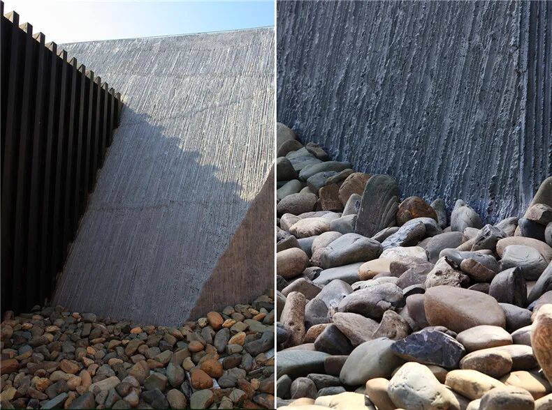 建筑基地地处深山,且甲方的预算实在有限,关于表皮的处理就很好地体现了建筑师对在地建筑的思考以及因地制宜的应变能力。湖北盛产竹子,于是竹跳板,当地最廉价的施工用品,就被作为了现浇混凝土外墙的模版。表皮大致平行的粗糙肌理,既可以创造遗址保护建筑的沧桑感,又降低了对施工团队的要求,当地方言谓其“以歪就歪”。