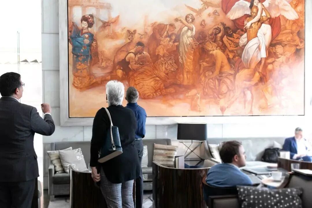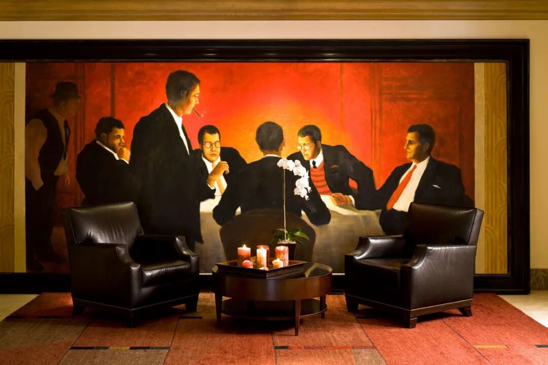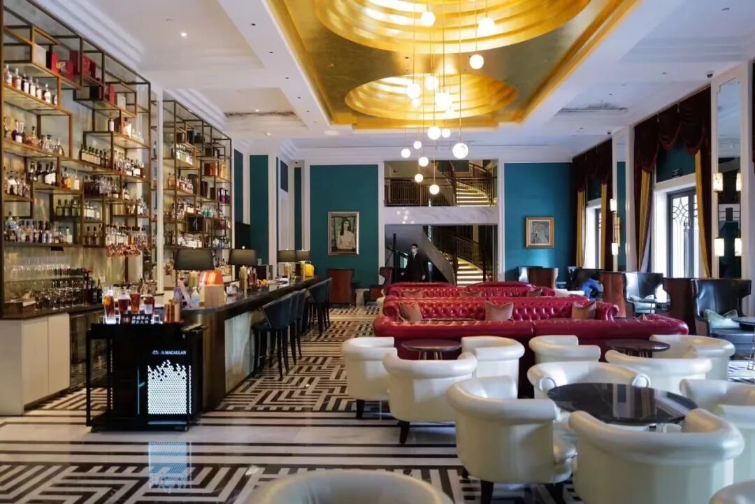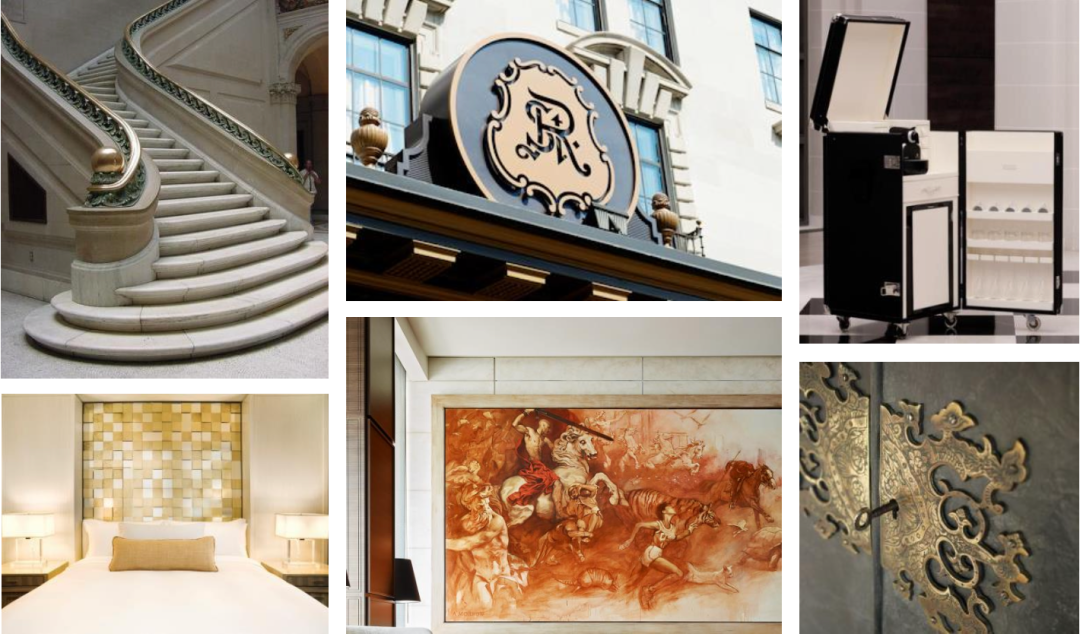 一般,一间瑞吉的场景需要包括落客区(Porte Cochere)、门厅(Entry Vestibule)、藏书阁、Drawing Room、酒窖,并需要缀以旋转楼梯、枝形吊灯、壁画、青铜装饰、建筑水印、戏剧性的花艺组团等等,至于忠于镀金年代还是焕新演绎,任凭“店”意。
