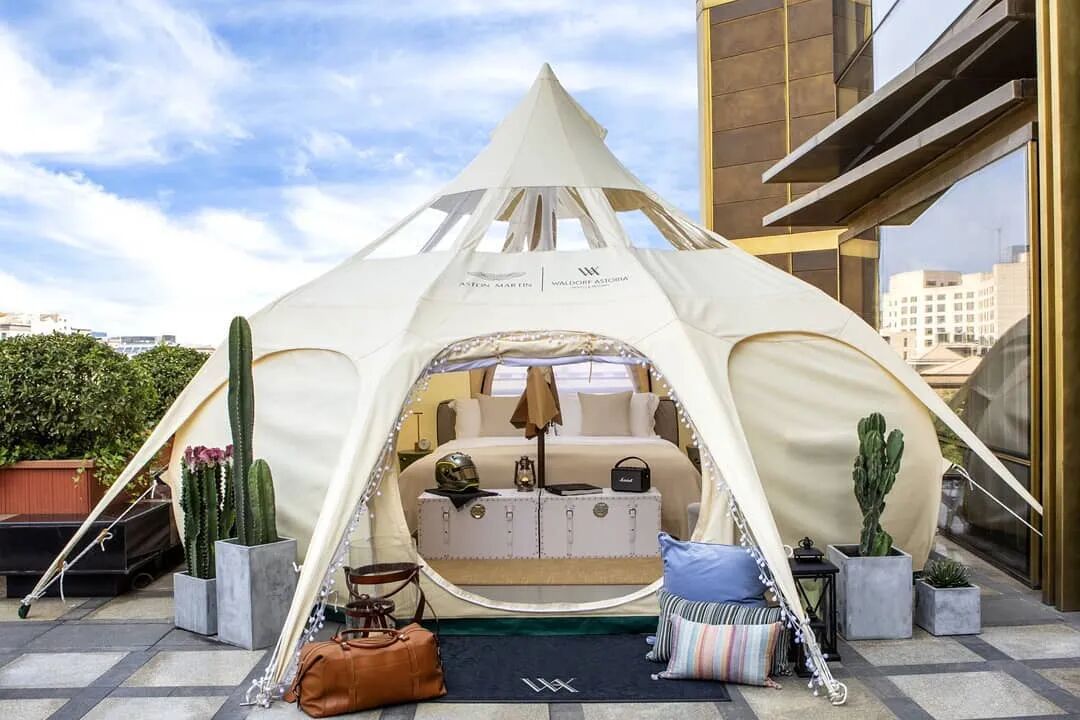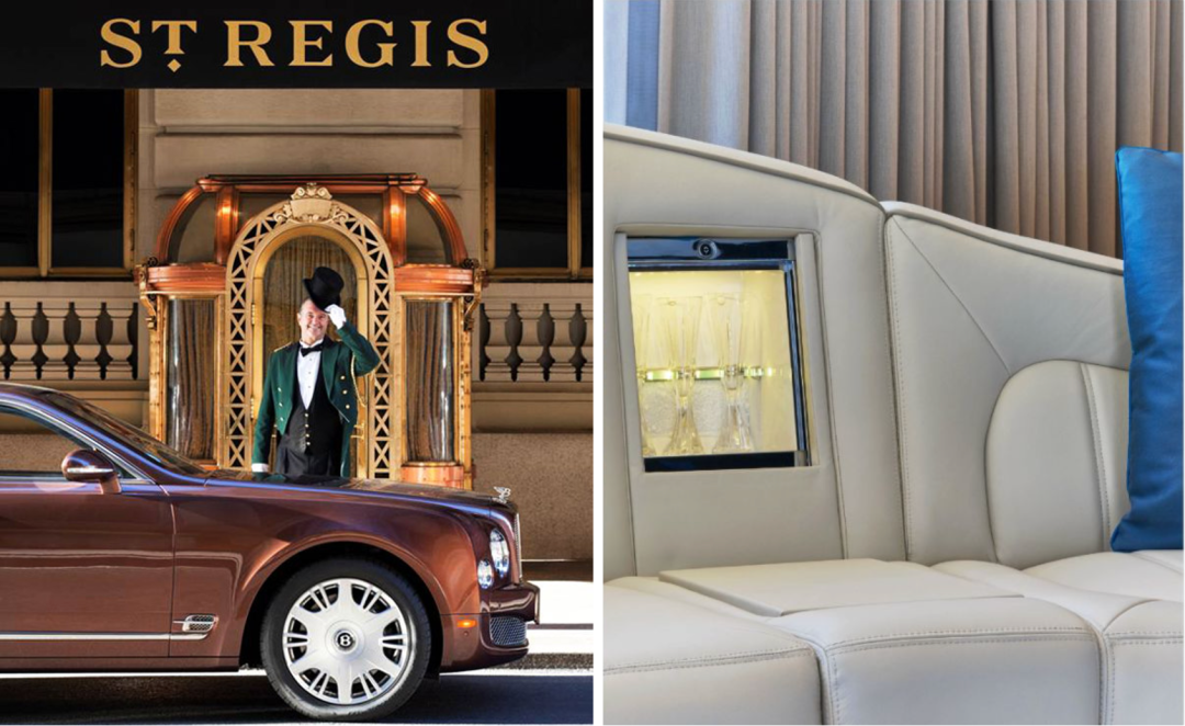 香车配美店向来是很重要的组合搭配,决定这一场旅程的丝滑美妙与否,华尔道夫钟情的香车品牌是阿斯顿马丁、瑞吉的选择是宾利。华尔道夫还和阿斯顿马丁联名了Glamping体验,瑞吉则在一些分号坐拥宾利套房。顺便提一嘴,纽约瑞吉门口有一个独特的玻璃亭,这是很早以前让门童为宾客优雅打车的机器(进亭,按按钮,雨棚顶上的打的指示灯就会闪烁)。
