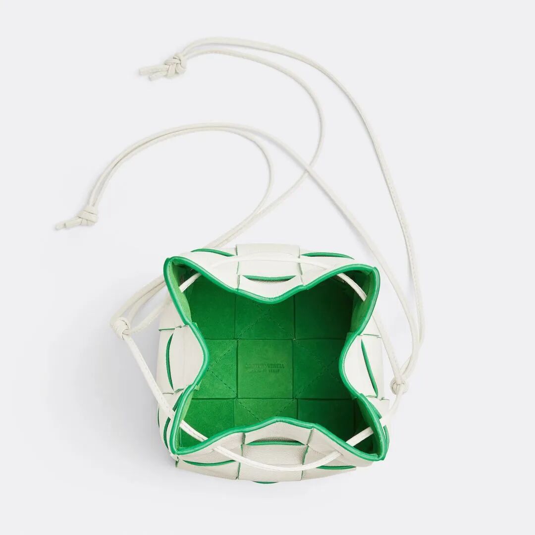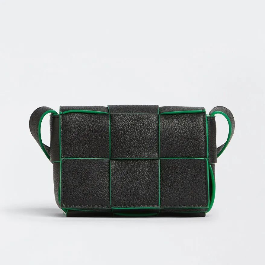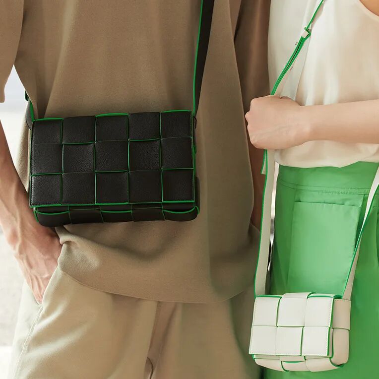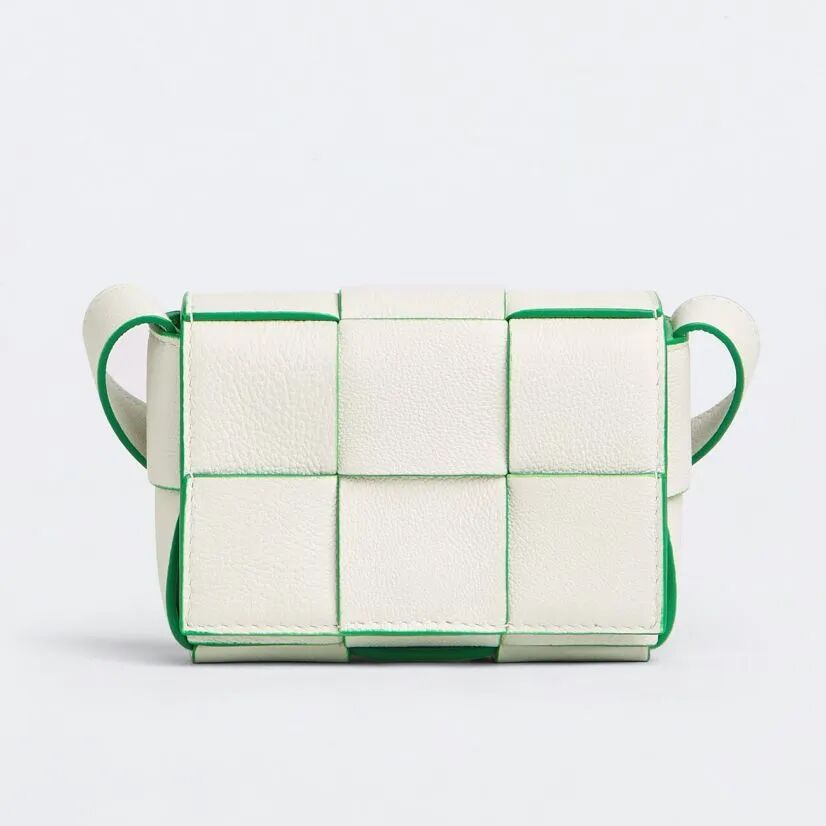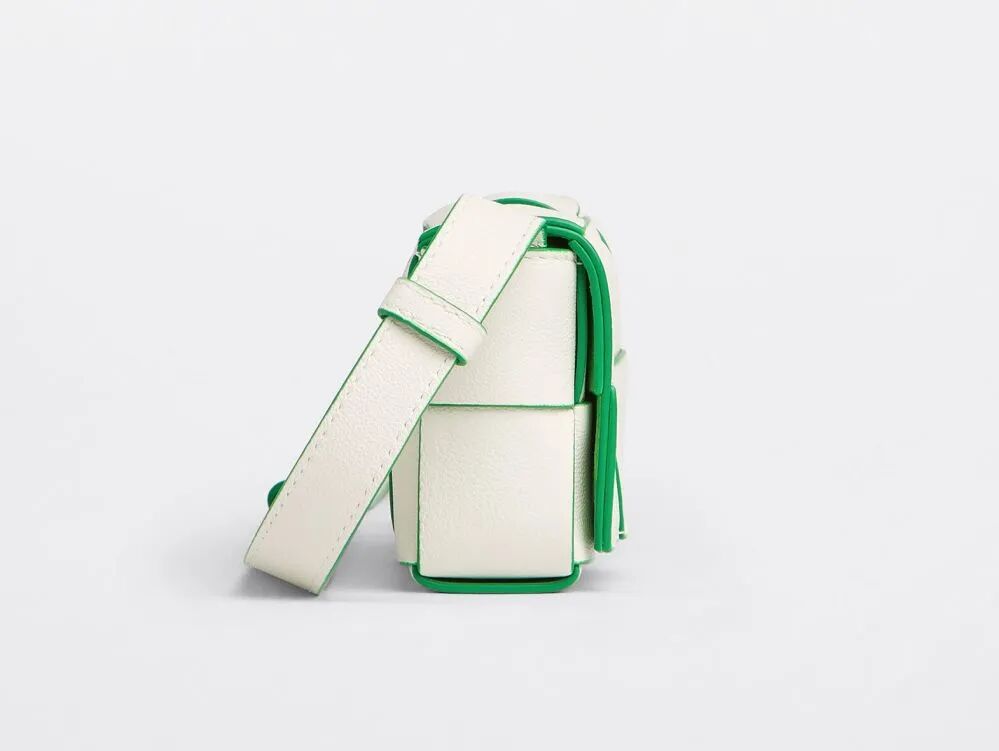 以水牛皮编织工艺Intrecciato,将品牌招牌的皮革编织技法放大,在这次七夕限定系列中呈现白色和黑色款拼鹦鹉绿的CASSETTE。