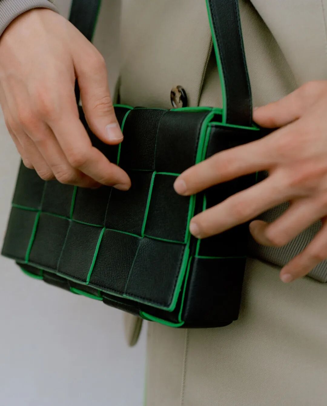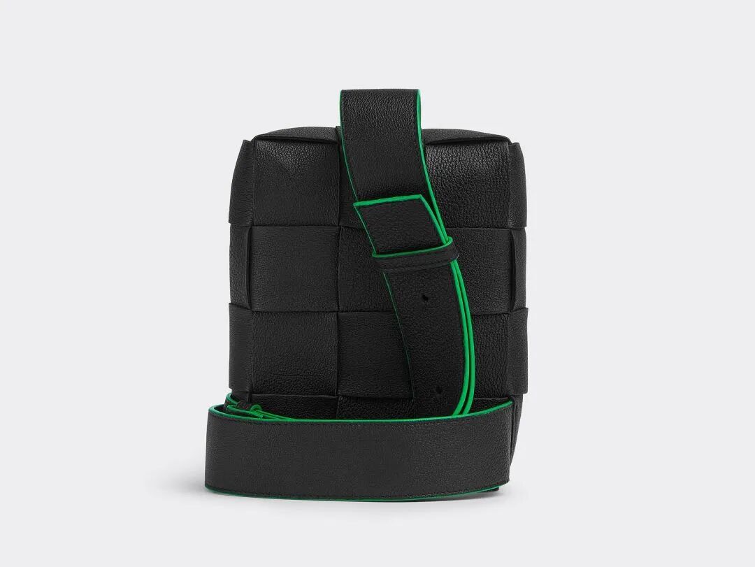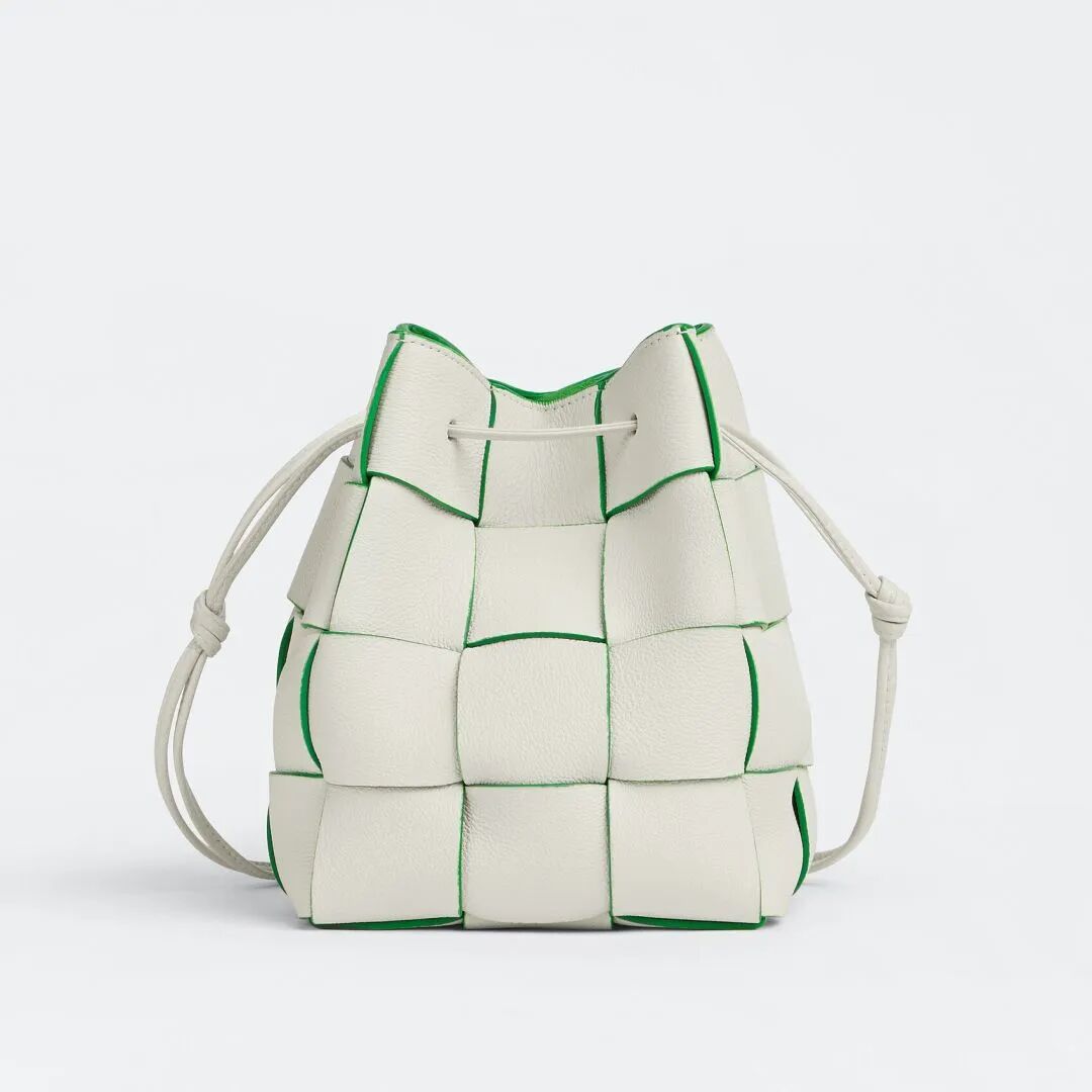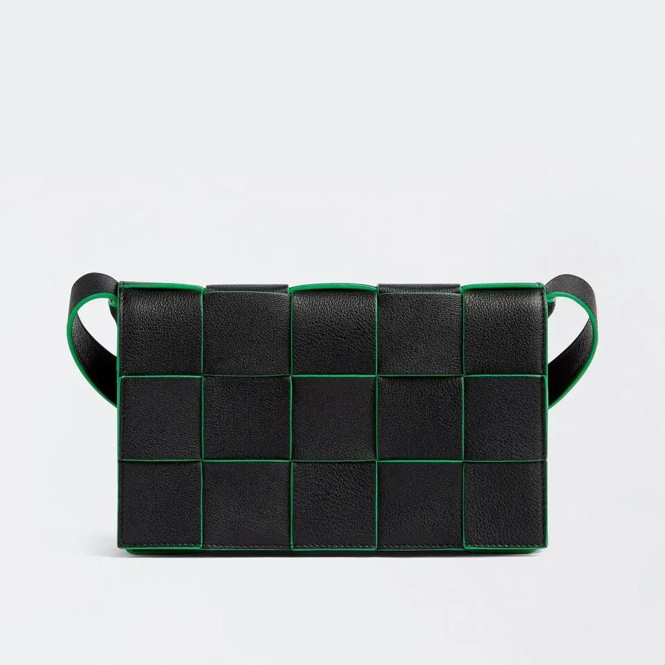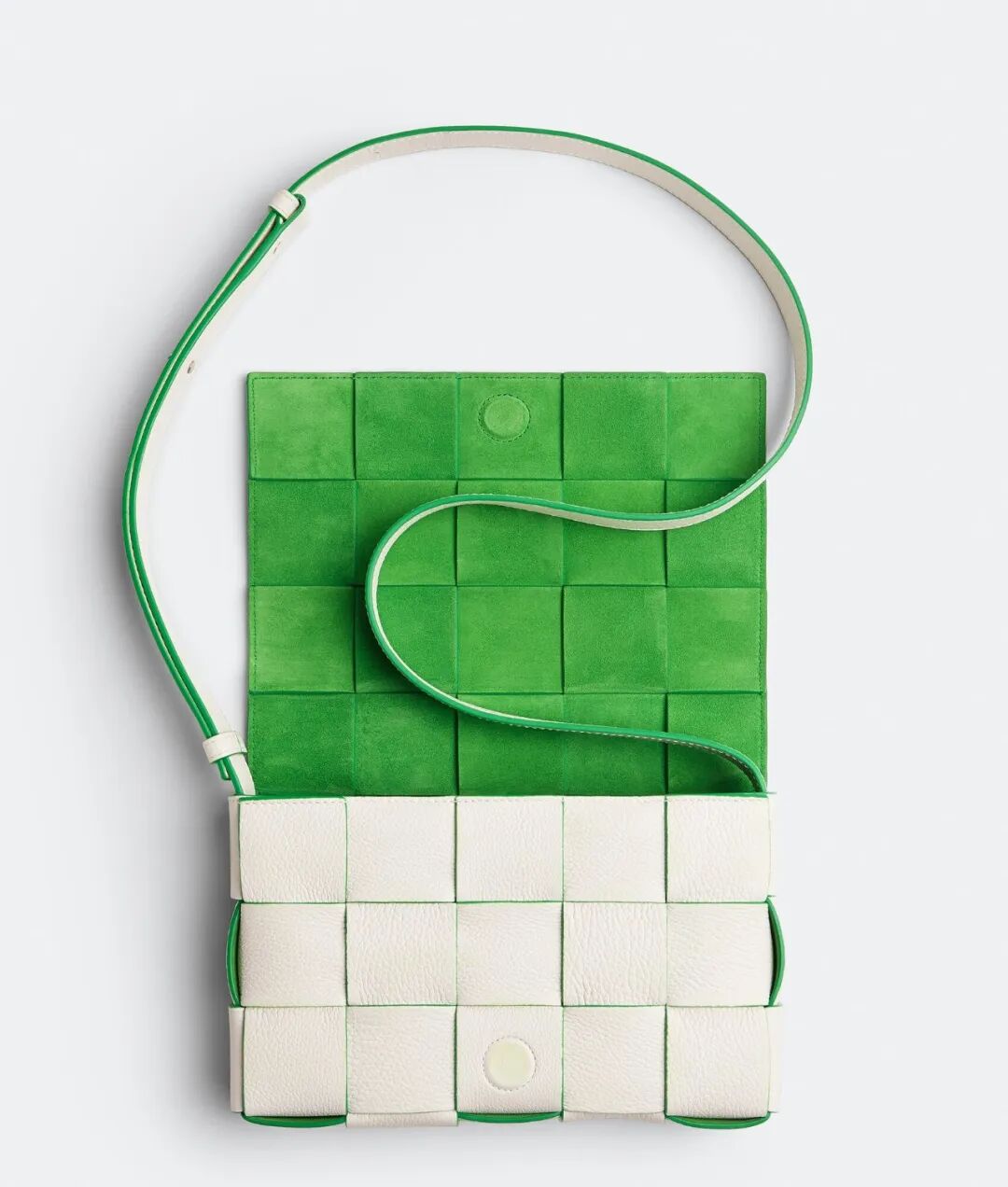 以水牛皮编织工艺Intrecciato,将品牌招牌的皮革编织技法放大,在这次七夕限定系列中呈现白色和黑色款拼鹦鹉绿的CASSETTE。