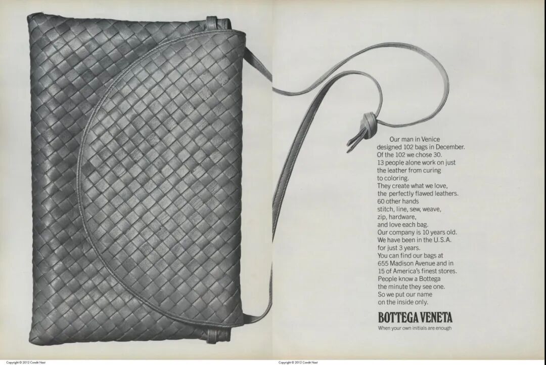 她还请来了前老板Andy Warhol为品牌策划了平面广告,独家刊登在1978年的《Interview》杂志上。她在广告上写下:“People know a Bottega the minute they see one. So we put our name on the inside only.”(人们见到Bottega的那一秒就认出了我们,所以我们只把名字印在包内)。