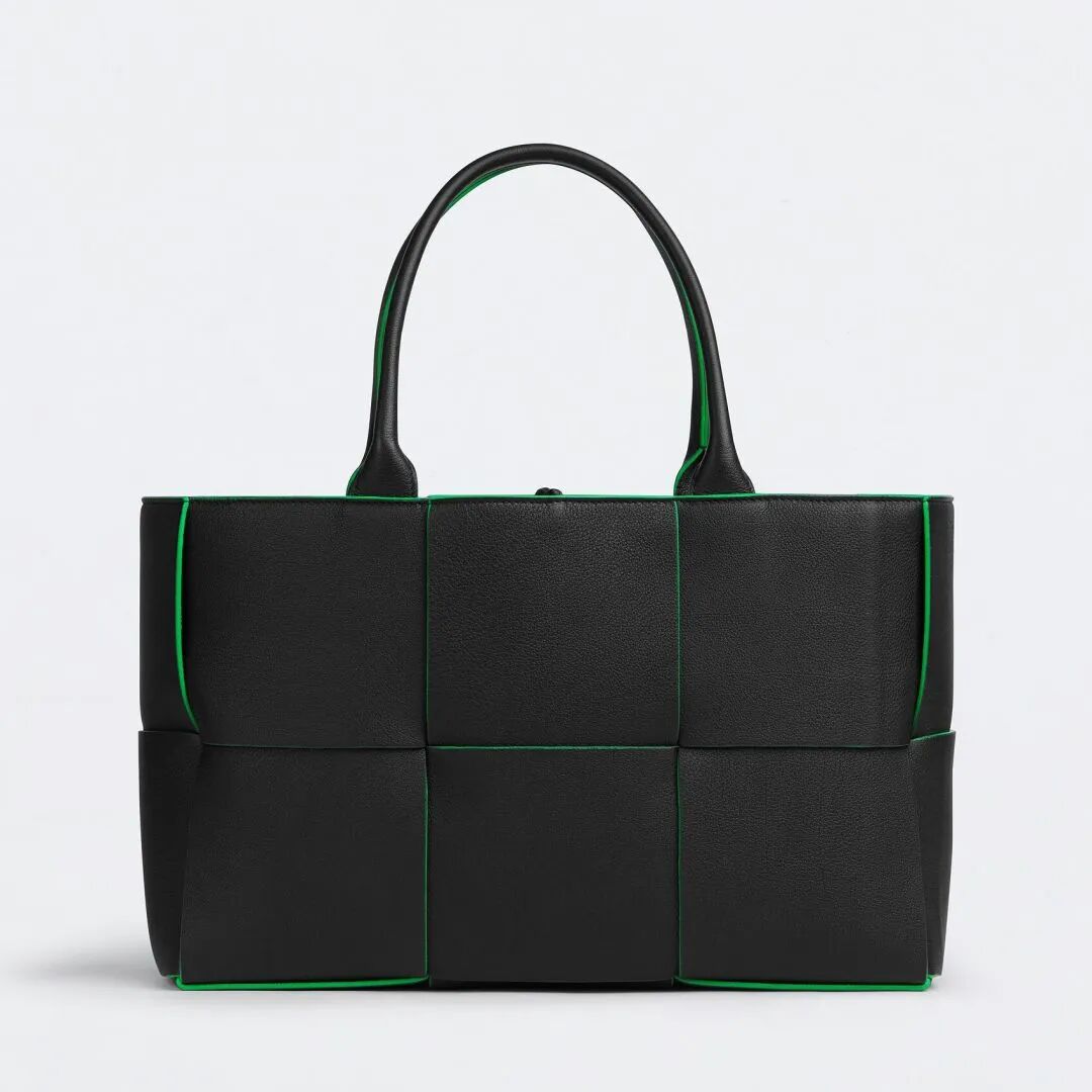 ARCO托特手袋灵感来自米兰地标建筑和平之门(Arco della Pace)。大块、拼接的皮革使其端庄大方,隐隐约约的绿色滚边打破了黑或白的单调。尺寸上,放进iPad也不在话下。