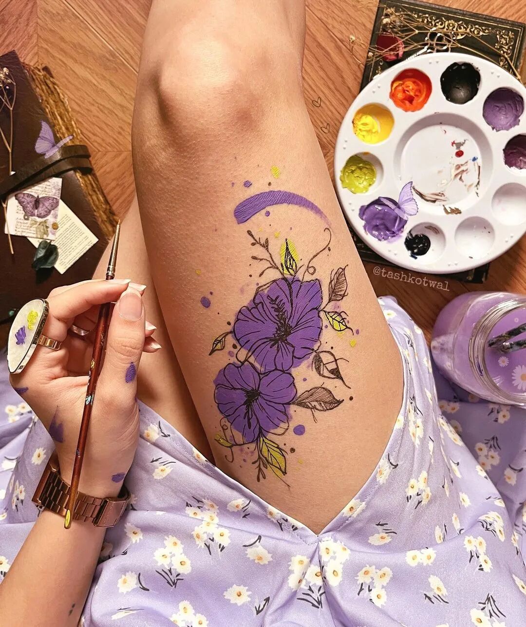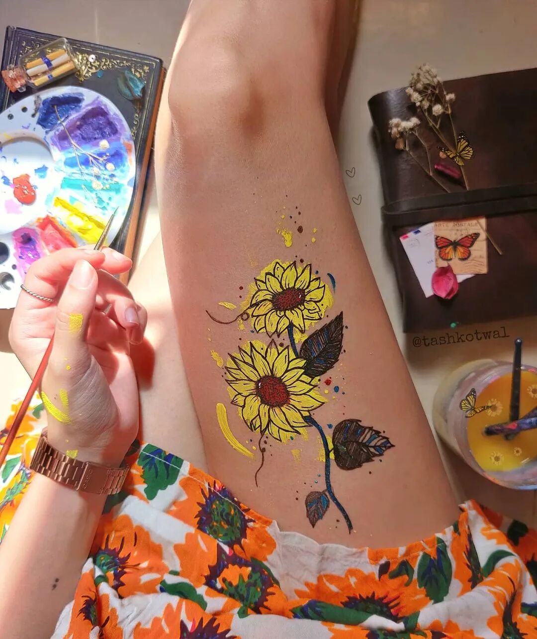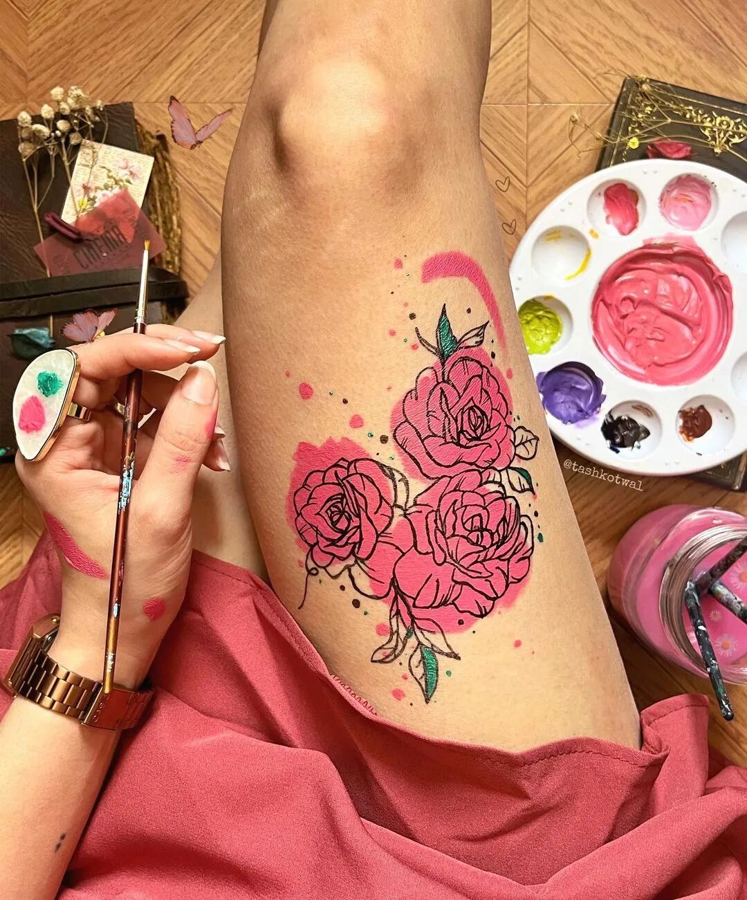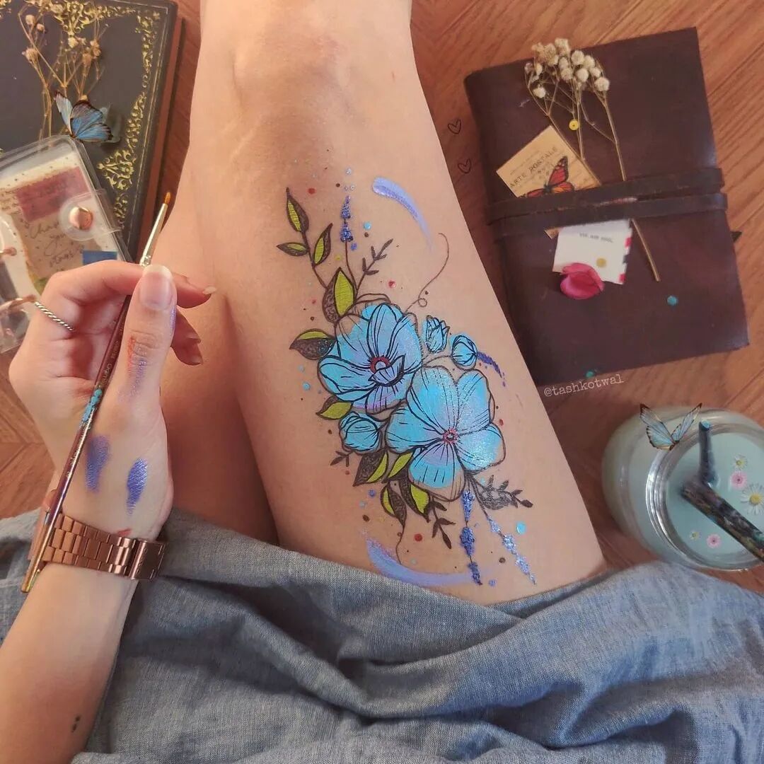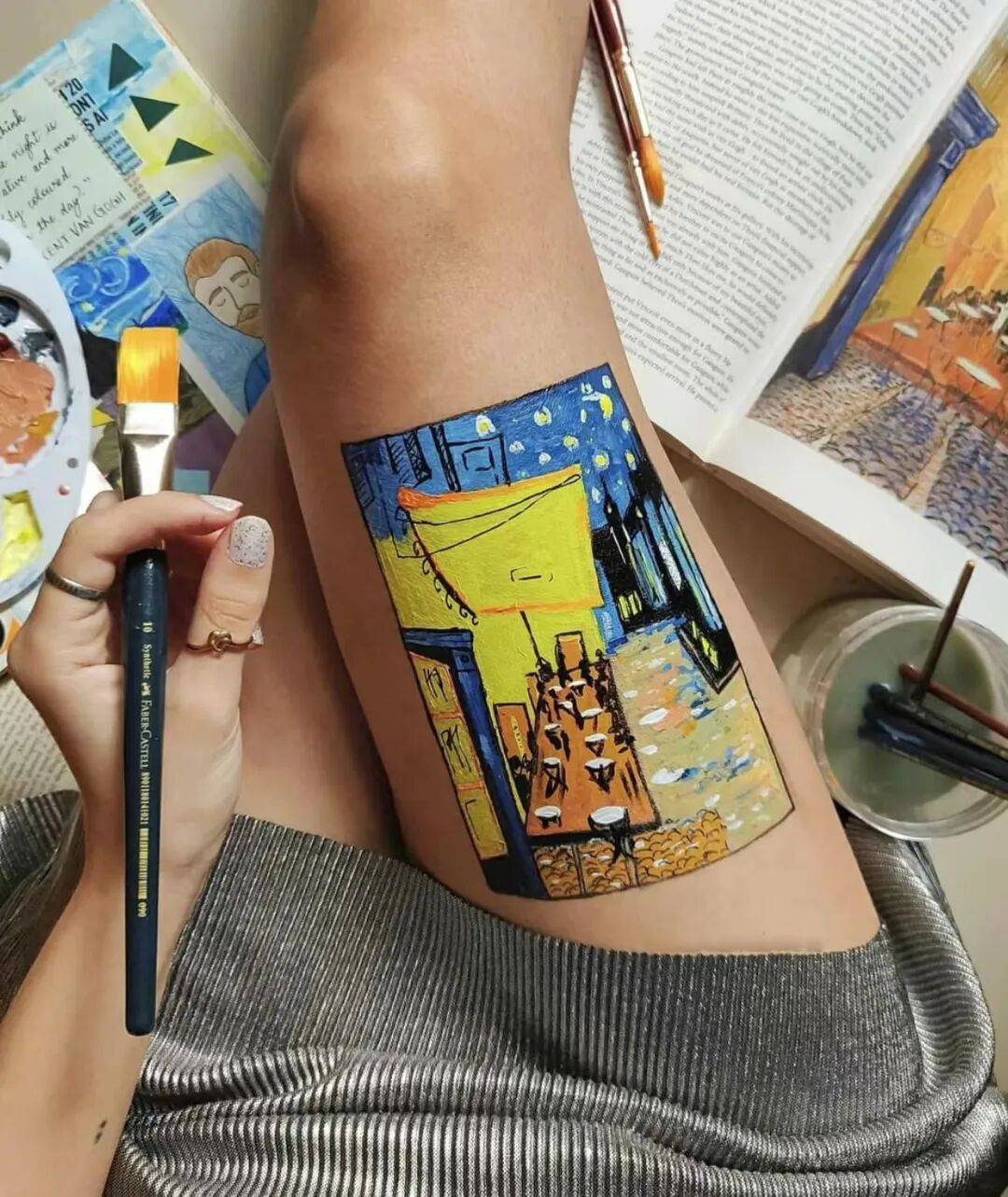 Natasha创作艺术想要独一无二,所以选择自己的大腿为画布,用可冲洗的颜料作画,灵感来的时候掀起裙子,画出与裙子同色系的娇艳欲滴的花卉或是其他。