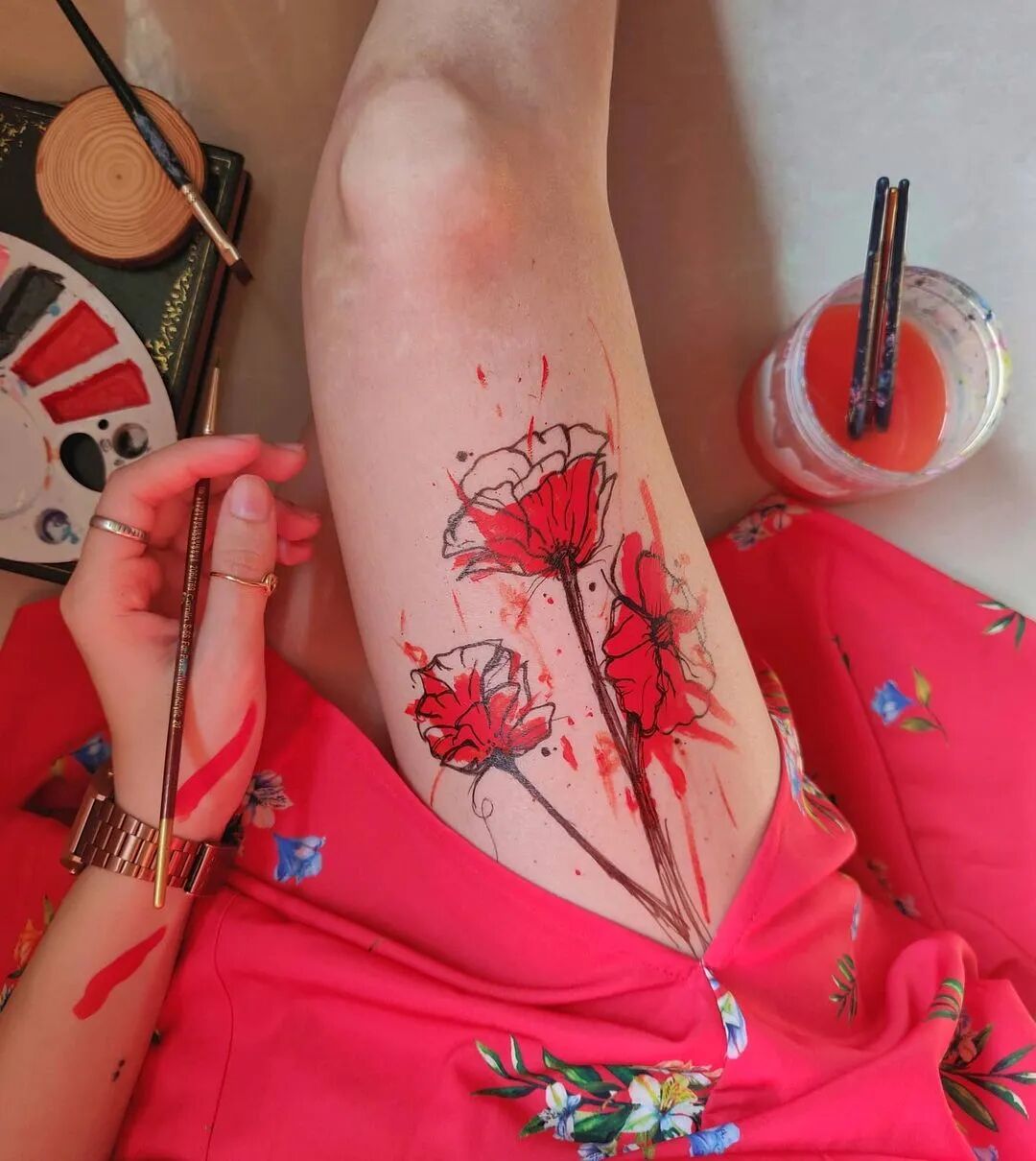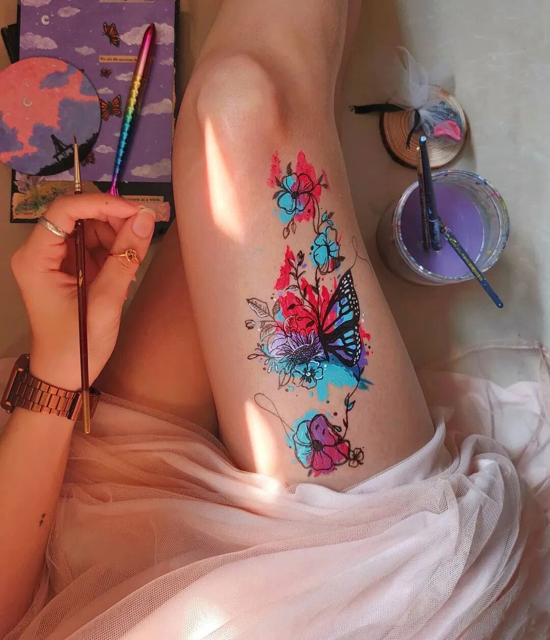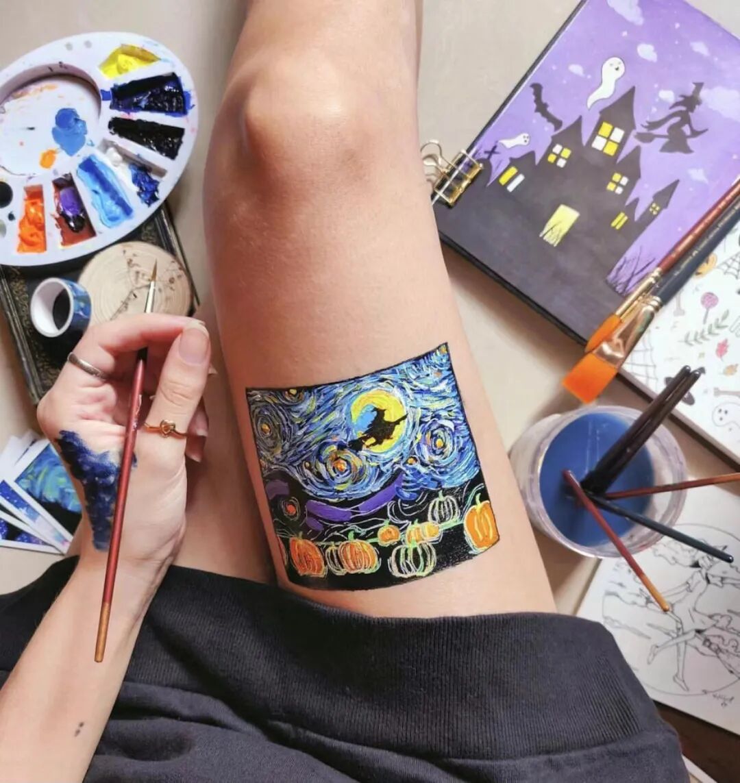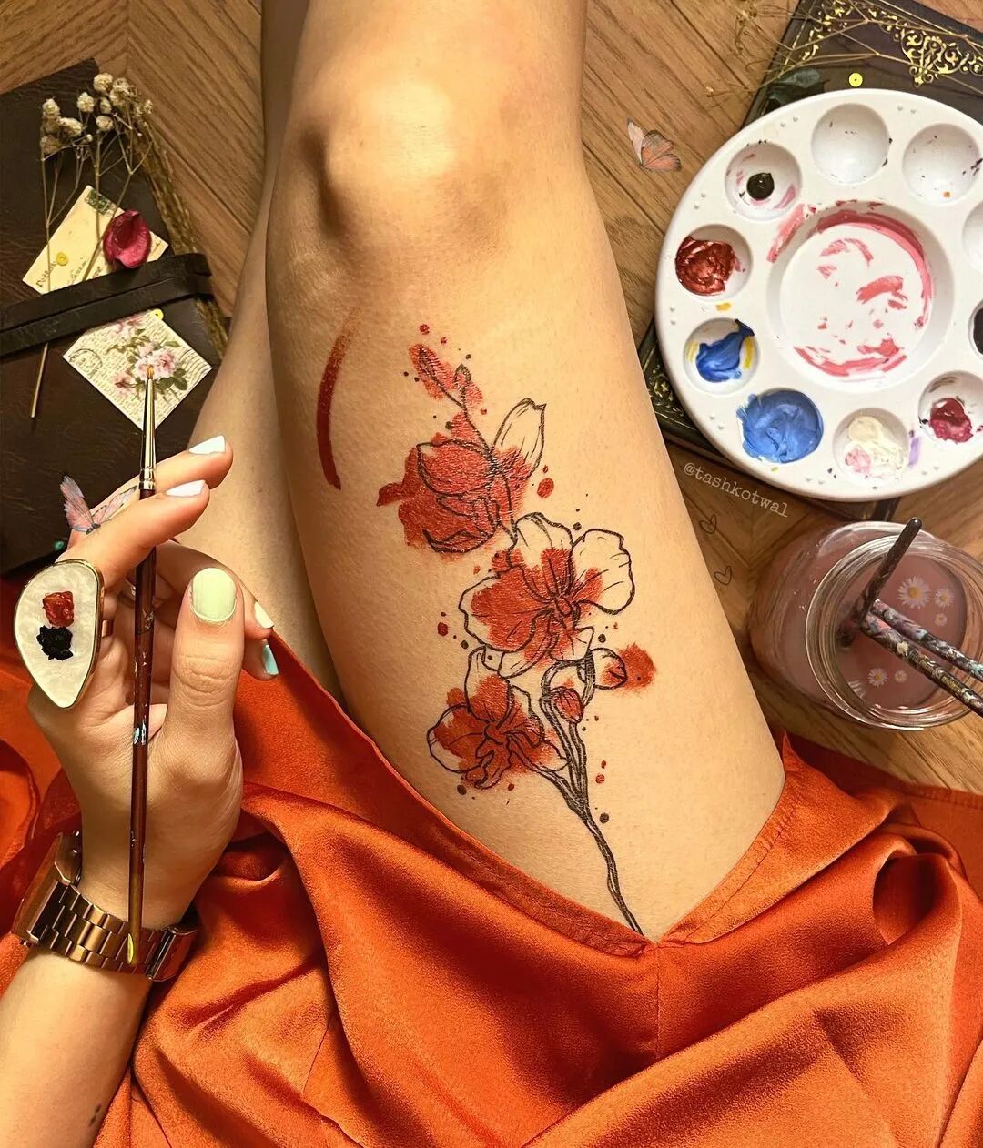 Natasha创作艺术想要独一无二,所以选择自己的大腿为画布,用可冲洗的颜料作画,灵感来的时候掀起裙子,画出与裙子同色系的娇艳欲滴的花卉或是其他。