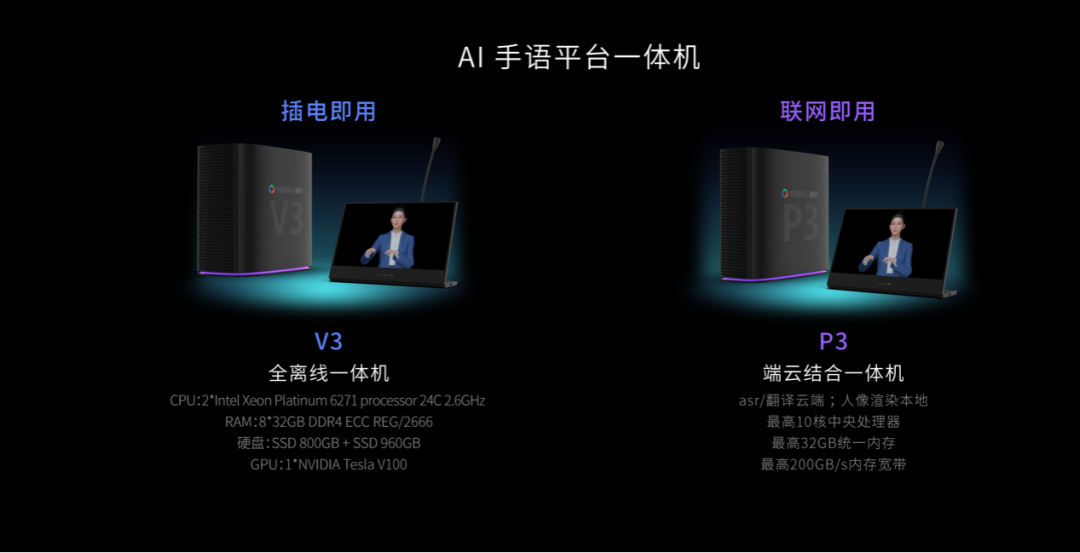 端云结合一体机,则通过云端计算+本地渲染的形式,也能灵活地实现手语服务。
