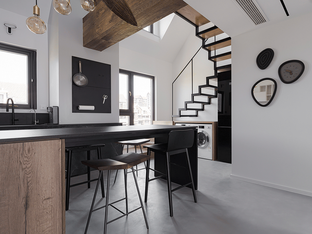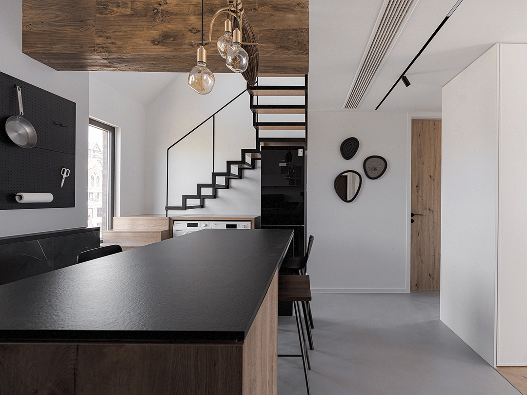踏步是有宽度的,拉平怼上立柱,刚好凸出来一截,怎么处理?怎么收口?就让橱柜一排整体外移,让橱柜和楼梯整体拉平。
