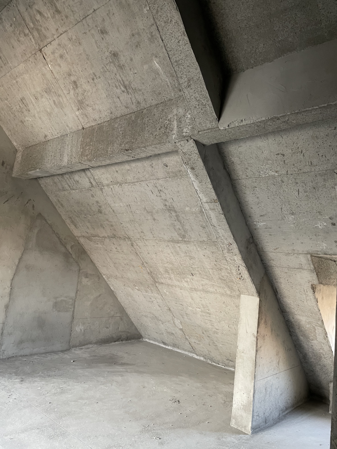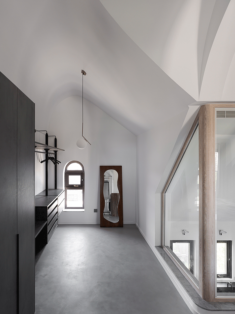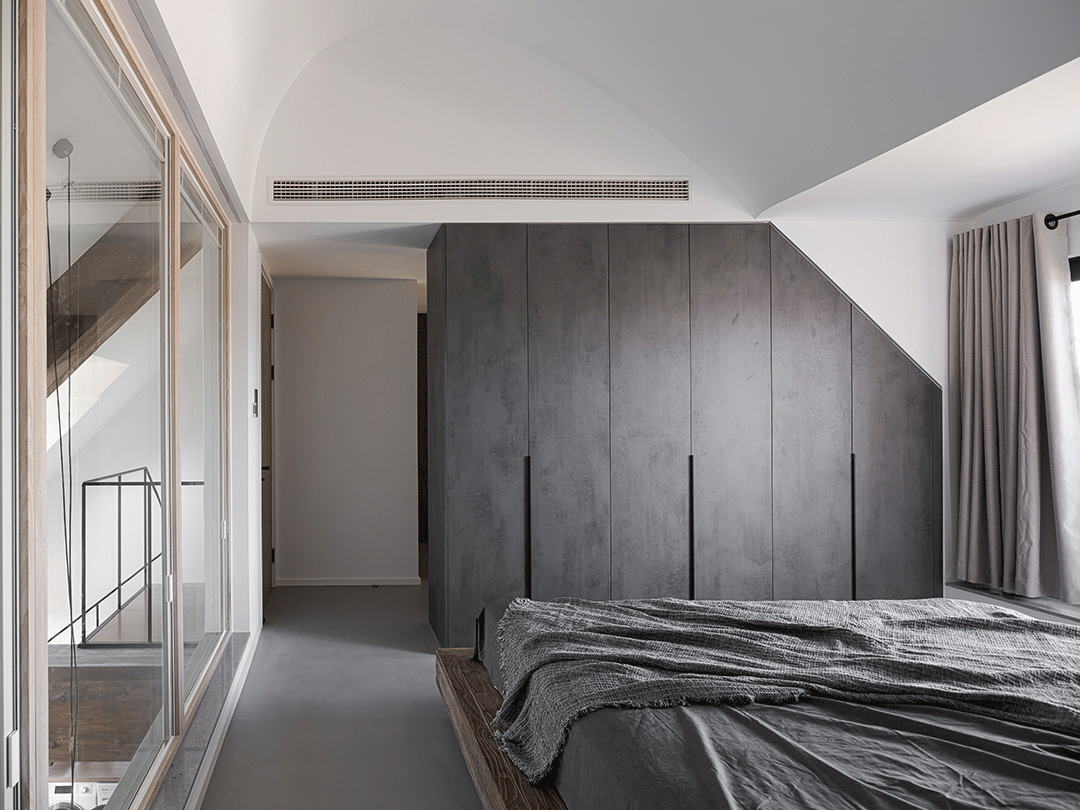 原顶面是坡屋顶,结构复杂,而且夹角比较尖锐。从风水的角度看,卧室内的夹角会给人不好的暗示,是需要做遮蔽处理的。