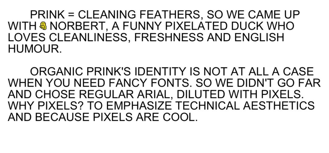 Organic prink是一个有机玻璃清洗剂品牌,在设计和创意的帮助下将平凡的事物变成非凡的事物。加油站和汽车经销商的货架上经常摆放着玻璃清洗剂。寻找一个能突出货架上有机 Prink 的富有表现力的符号,Prink = 刷羽毛,这就是为什么设计师想出了 Norbert,一个喜欢干净、新鲜和英式幽默的有趣像素鸭。让购买过程增添了一丝浪漫的荒谬感,让它变得更有趣。有了像素鸭,一切都会变得更好。