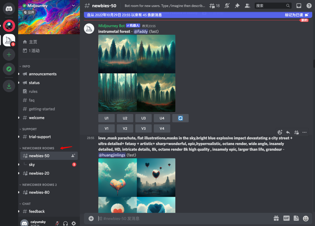 2)进入到discord,随便选择一个新加入用户的分组。你应该能看到很多人在群组里不断生成新的AI图片,此时你其实已经可以在这里开始你自己的AI作画了。
