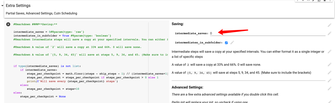 在Extra settings中设置intermedite_saves中设置存多少过程图,一般看最终结果就行,设置为0。