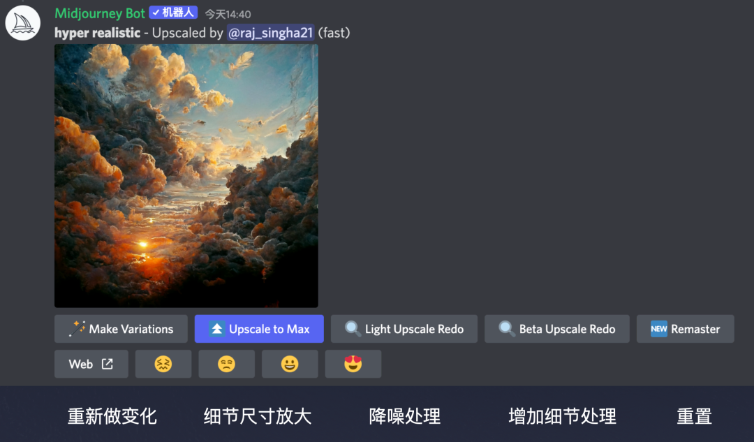 再次生成图片后底部有几个功能,分别是重新做变化、细节尺寸放大、降噪处理、增加细节处理和重置效果。