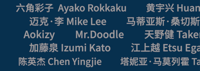 私洽艺术家:六角彩子Ayako Rokkaku、黄宇兴Huang Yuxing、哈维尔·卡勒加Javier Caleja、五木田智央Tomoo Gokita、艾德加·普连斯Edgar Plans、迈克·李Mike Lee、马蒂亚斯·桑切斯Matias Sanchez、巴尔杜·郝尔加森Baldur Helgason、肯尼·沙夫Kenny Scharf、Tide、Aokizy、Mr.Doodle、天野健Takeru Amano、山本麻友香Mayuka Yamamoto、平子雄一Yuichi Hirako、加藤泉Izumi Kato、江上越Etsu Egami、加贺温Atsushi Kaga、川岛秀明Hideaki Kawashima、孙一钿Sun Yitian、陈英杰Chen Yingjie、塔妮亚·马莫列霍Tania Marmolejo、乔治·莫顿·克拉克George Morton-Clark、金田凉子Kaneta Ryoko、下田光Hikari Shimoda
