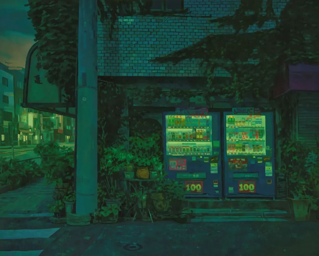 为什么喜欢他的画,原因很简单,因为我喜欢爱德华·霍珀(Edward Hopper)和彼得·多伊格(Peter Doig)。而他的作品你慢慢看,是能感觉画中除了用古典绘画的技法和构图外,便利店、自动贩卖机、停车场、电车站等都市日常,都因为他画中的光线和色彩成为了独特的现实主义世界。