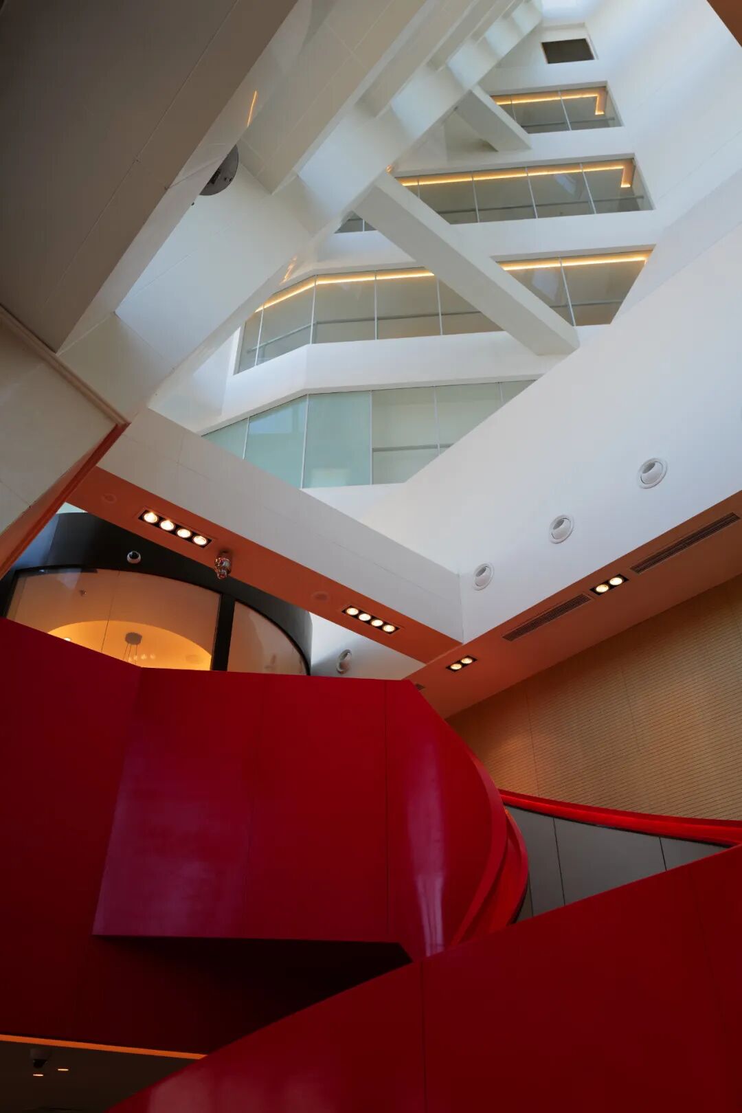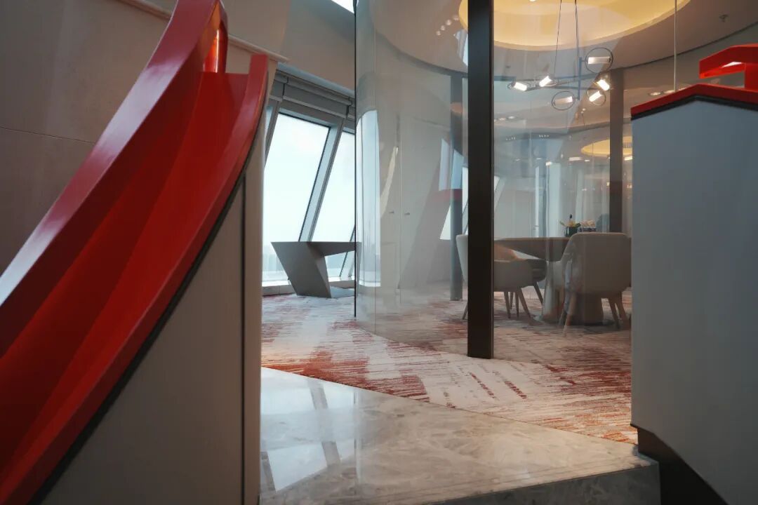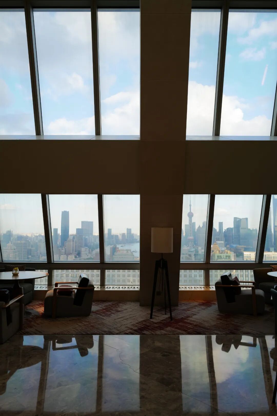 塔楼中部的收口部位,坐落着酒店的行政俱乐部,这处行政俱乐部的良心程度实属感人——坐拥了欣赏外滩、陆家嘴和浦江三合一美景的绝佳视角;头顶着贯穿7层的温室中庭;并由一段红色旋转楼梯舒展至静谧的专属会议空间。