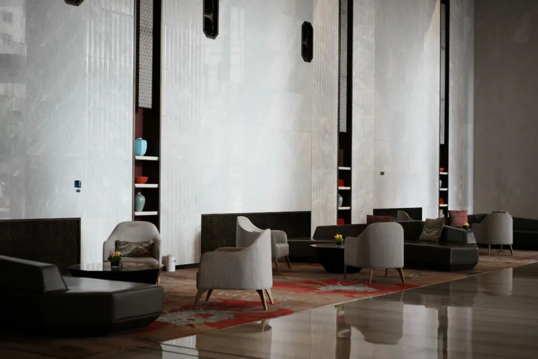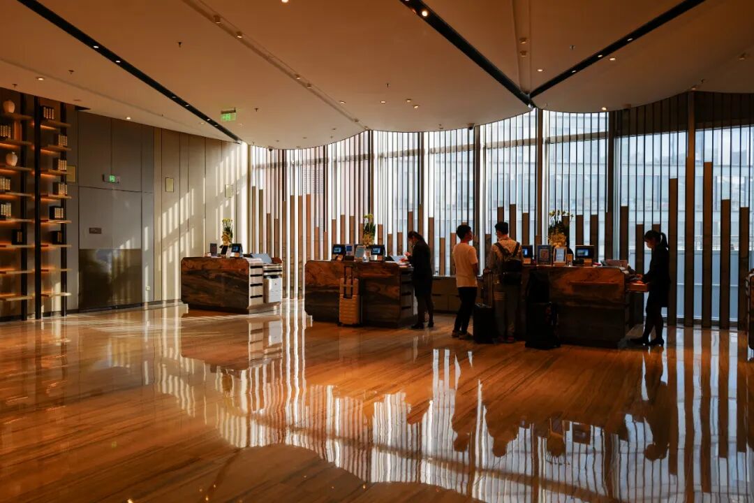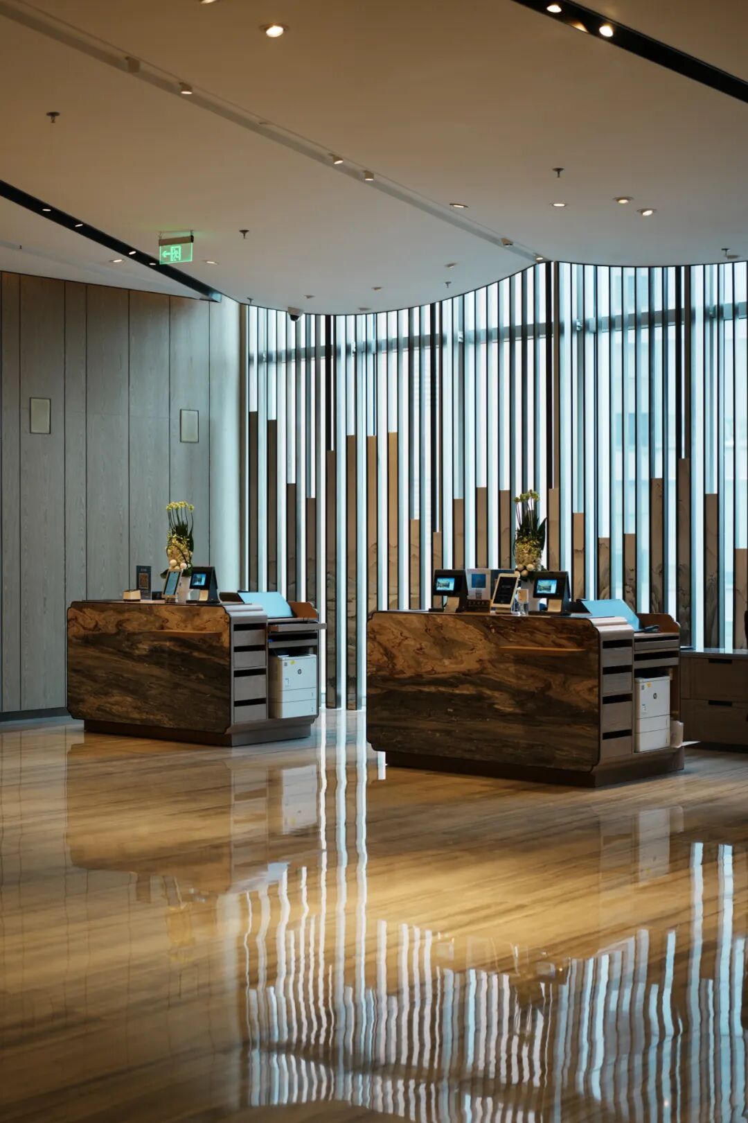 接待前台呈中岛式设计,模糊了前台的边界感,让员工与宾客的交流和互动更亲近从容。