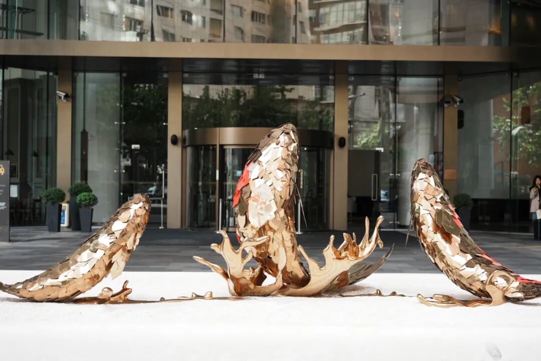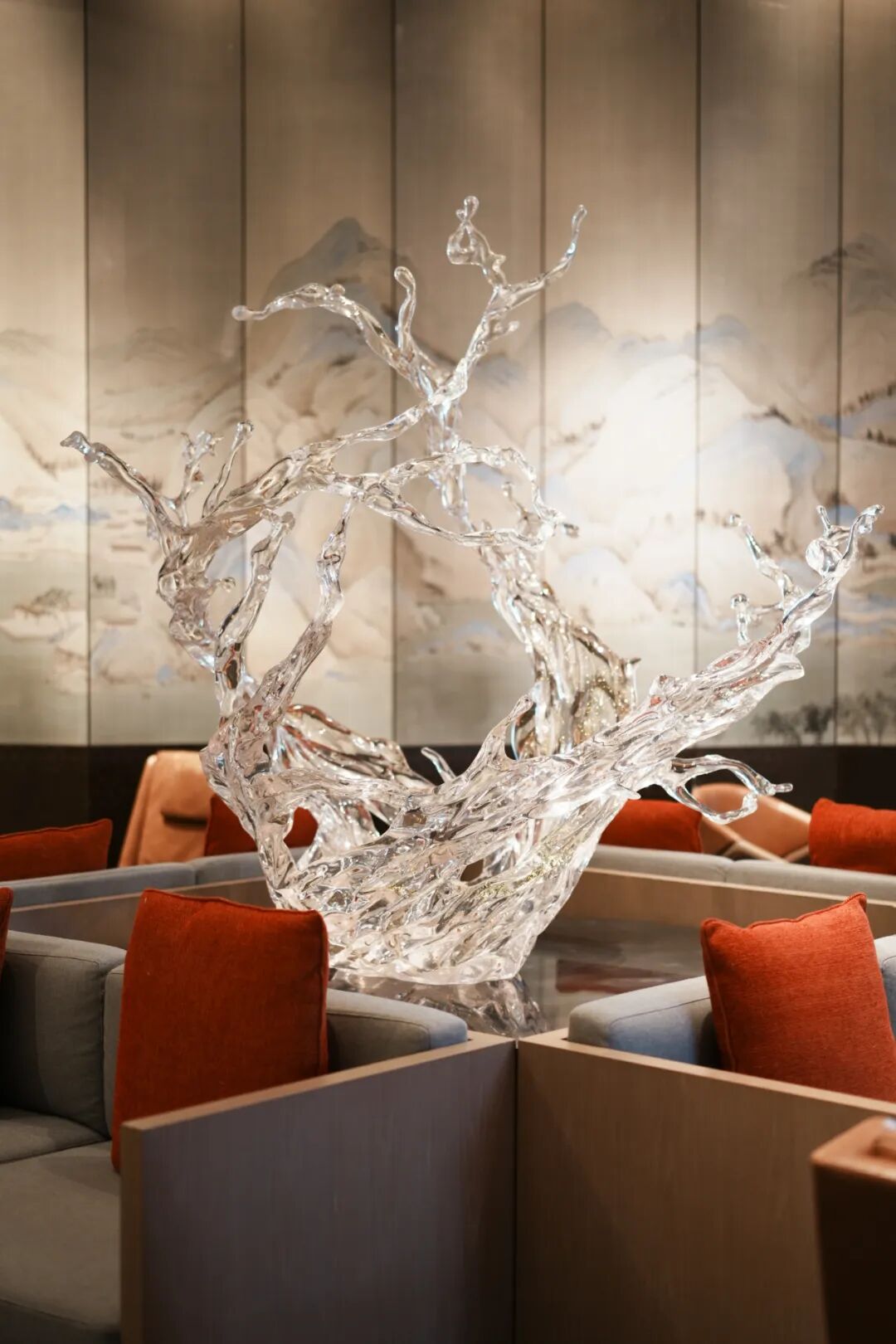▲ 落客区用一组涵盖锦鲤和水元素的雕塑,在都市喧嚣深处抽象演绎中式庭院的神韵。