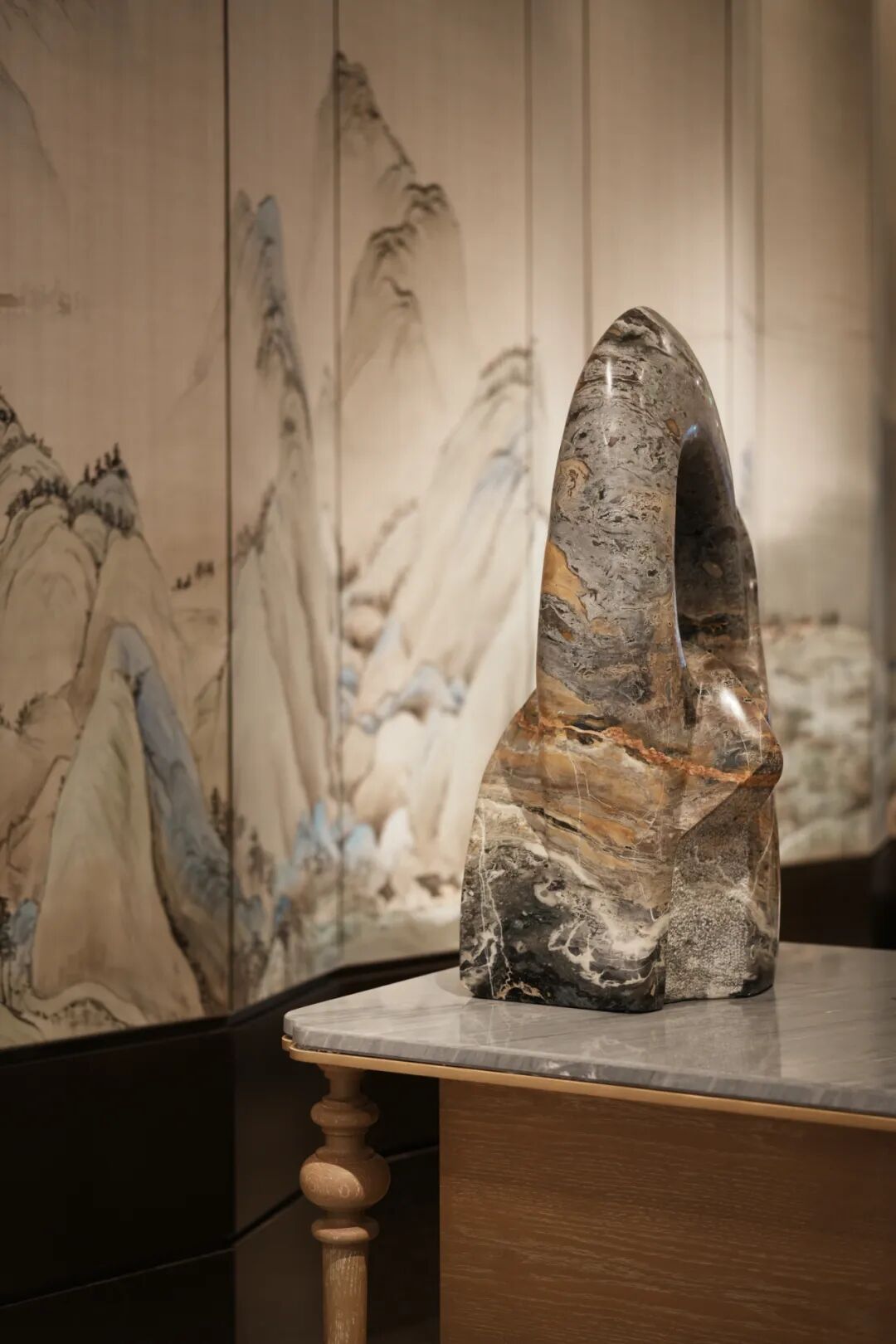 ▲ 抽象石质雕塑与山水屏风上起伏的山峦相映成趣