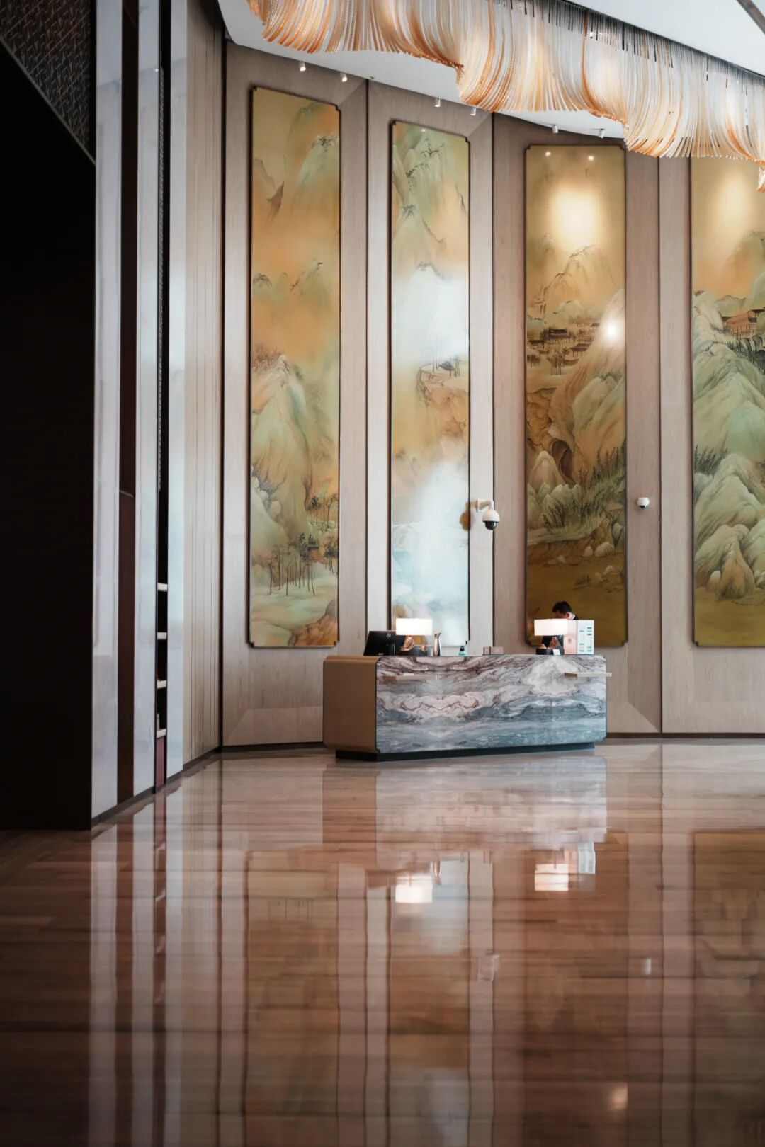 ▲ 独处底楼一隅的礼宾台,台面表壳石材的水波纹,与背后的山水壁画相映成趣。