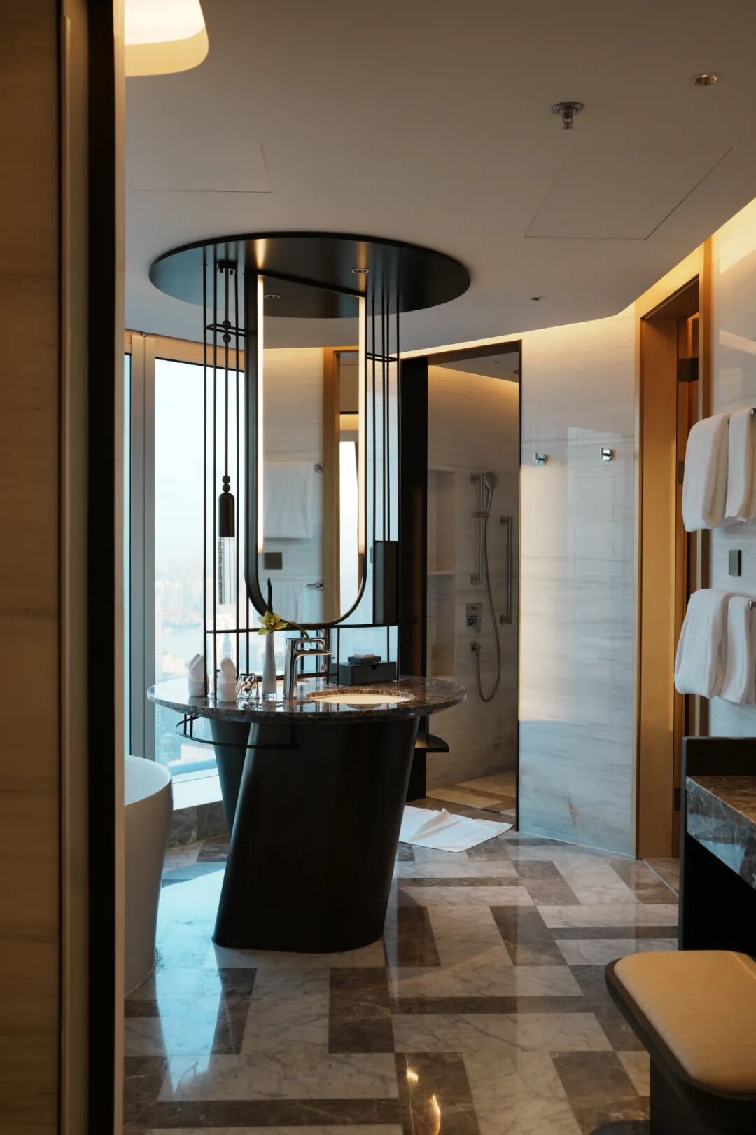 套房东向的江景空间留位给了浴室,为了尽显对江景的珍视和敬意,临窗空间被完全留白,浴缸、淋浴间、梳妆台,环绕嵌有面对面双台盆的立柱形盥洗台分布,梳妆台和盥洗台镜面都能反射出江景,让浴室做到了无死角江景。