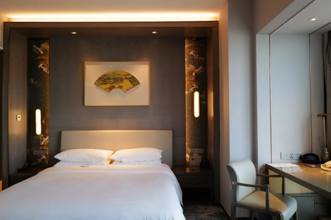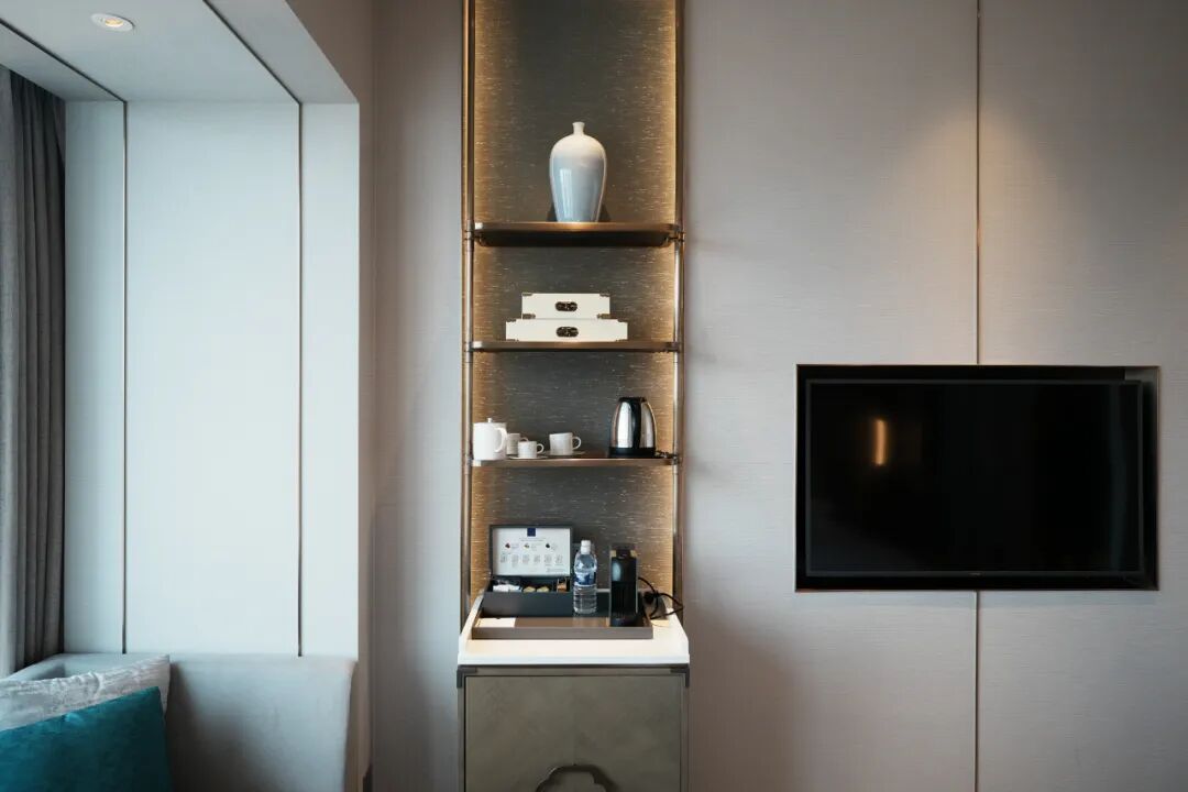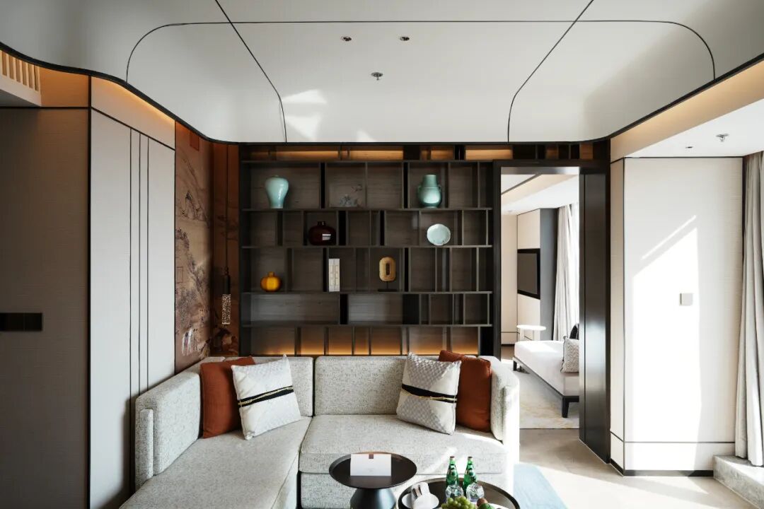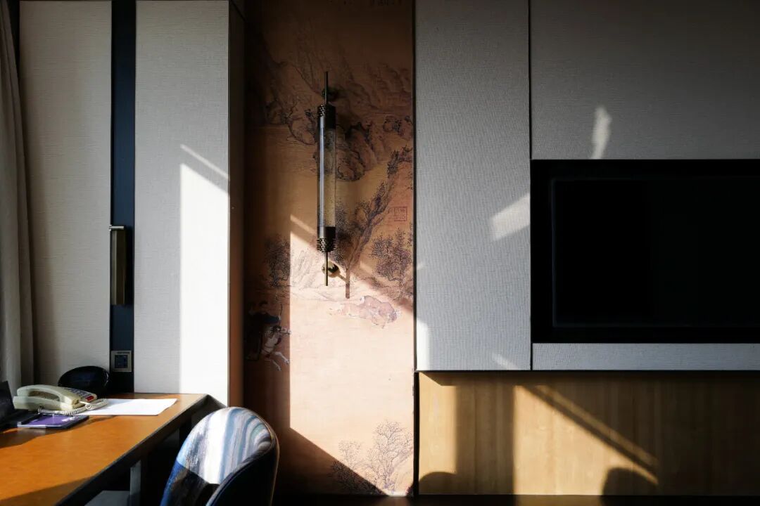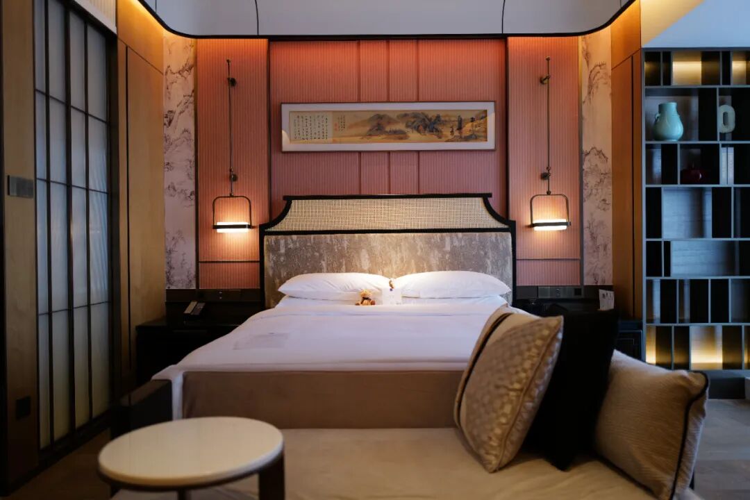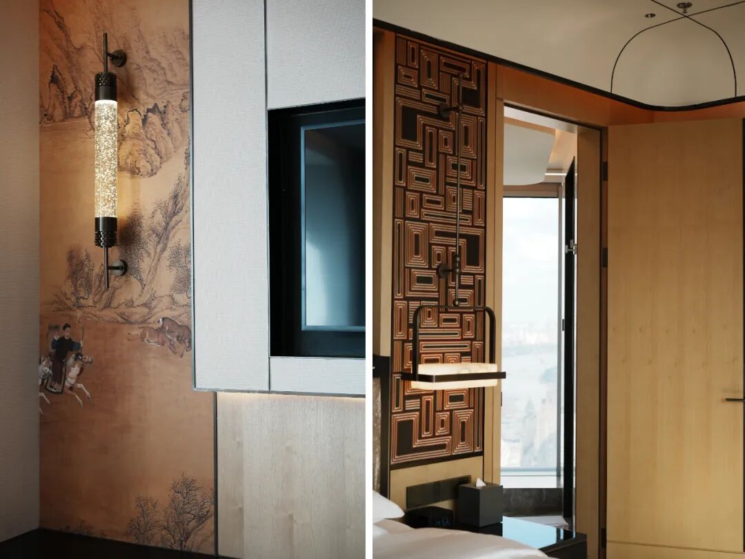 行政楼层客房更古雅雍容:交织着丝绒和藤编的床头、山水画卷和原木镶板共融的墙面、明清书柜风格的陈列架和灵感源自“华盖”的吊顶,加之中式古典元素和Art Deco神韵并进的风格,沉稳又不失惊喜。