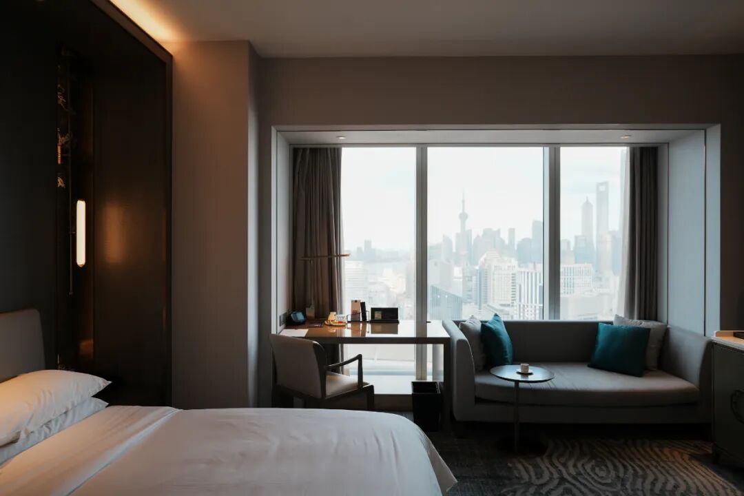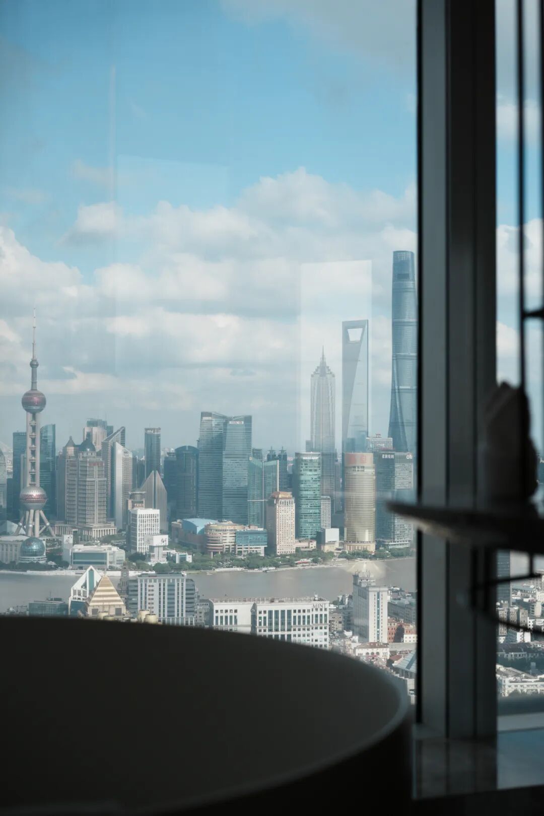 我这回入住的客房位于大厦端头位置,由东向和南向两排落地窗围拢:东向可欣赏黄浦江如波浪形T台在正前方蜿蜒而过,东西两岸的建筑如同秀场两侧的观众,尽情检阅各路航船在江面上呈现的流动盛宴。