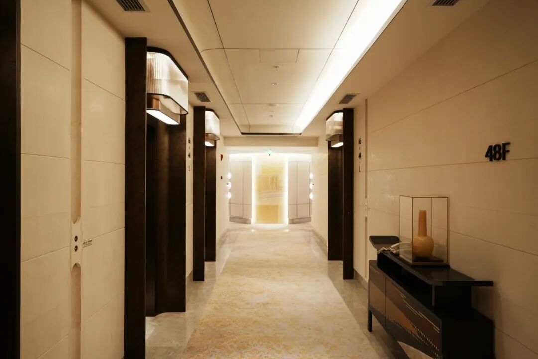 电梯和走廊,向来是构成超高层建筑的重要肌理,也是极易让人烦扰的元素。上海康莱德的处理诙谐且精彩纷呈。