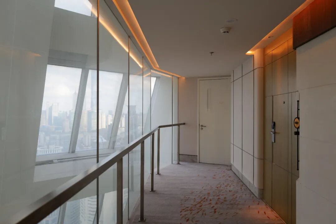 ▲ 建筑物多变外观,造就了每个楼层截然不同的空间肌理。部分客房楼层的客房沿玻璃游廊分布,兼得高空温室中庭、及外滩对话陆家嘴的壮丽景致。