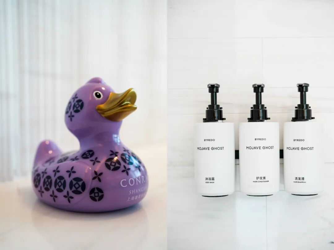 ▲ 一店一式的康莱德橡皮鸭;康莱德品牌全新启用的北欧香水世家BYREDO的王牌香调Mojave Ghost洗护系列。