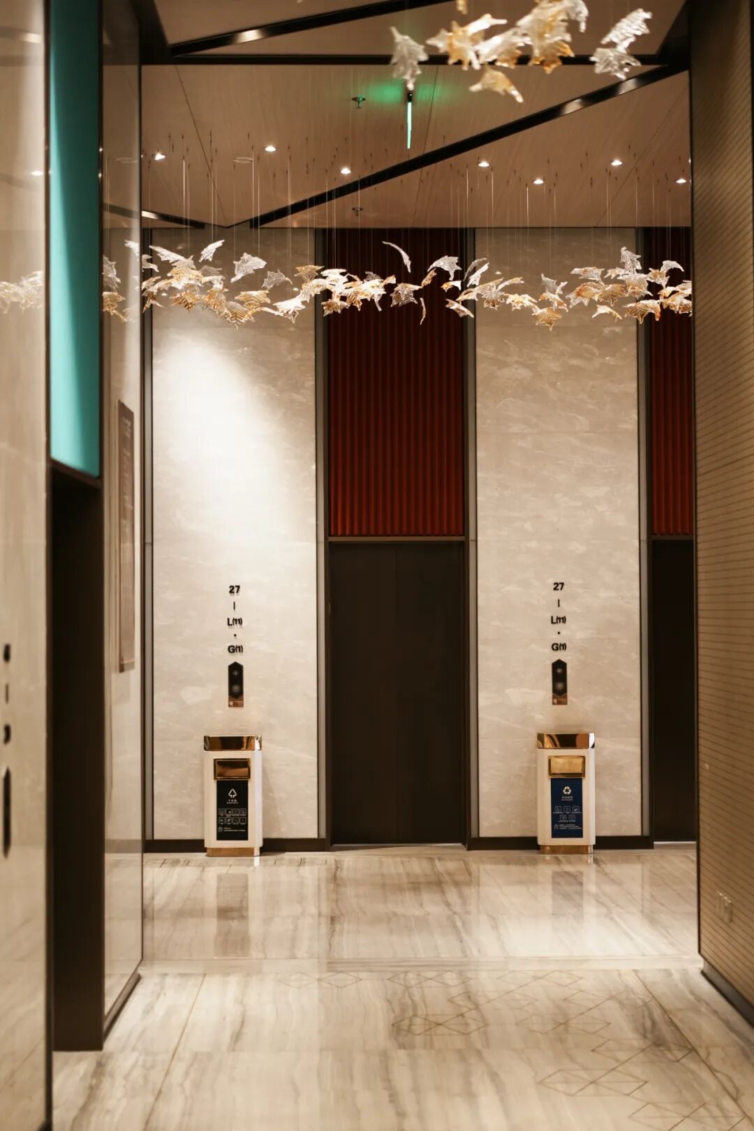 在空中大堂层“四通八达”的电梯厅上空,垂落着“漫天”琉璃梧桐叶,行进电梯厅如同徜徉上海历史街区的林荫道,一扫因超高层建筑复杂肌理而惯有的迂回和沉闷。