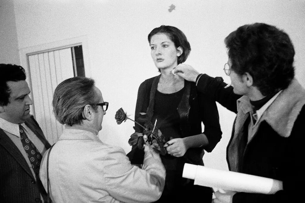 在此期间,她制作了一系列表演,她的身体既是主角又是媒介。在罗马博尔盖塞当代艺术博物馆展出的“节奏 10”(1973年)中,她有条不紊地用刀刺破手指间的空隙,弄伤了自己。在“节奏 0”(1974年)中,她在那不勒斯的莫拉工作室的一个房间里一动不动地站了六个小时,房间里放着72件物品,鼓励公众在她身上或对着她使用这些物品;其中包括一朵玫瑰和一把上膛的枪。