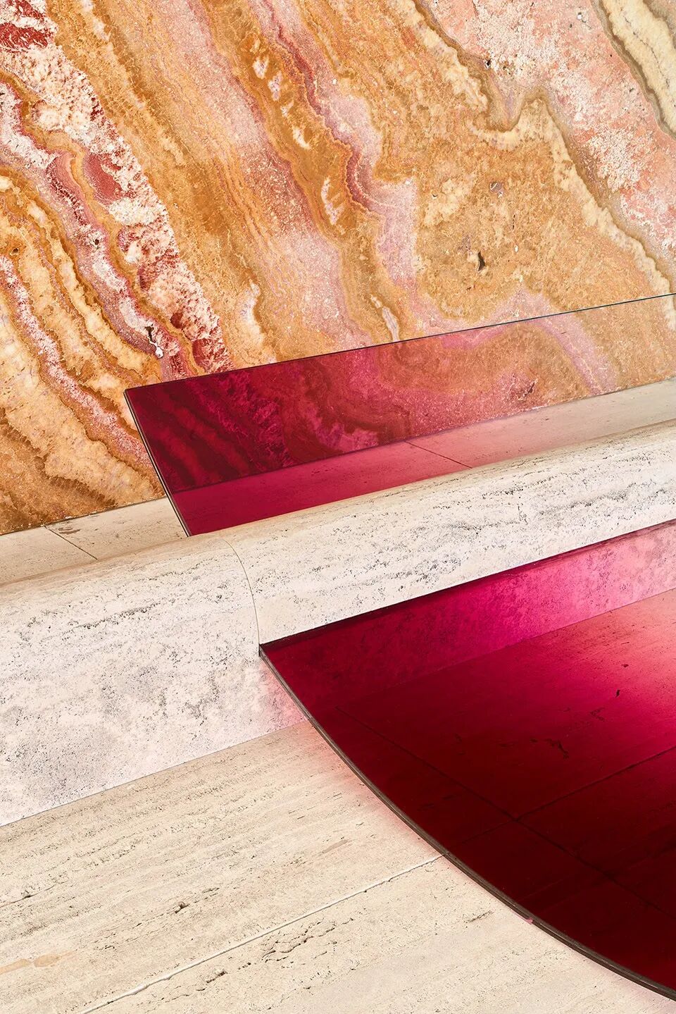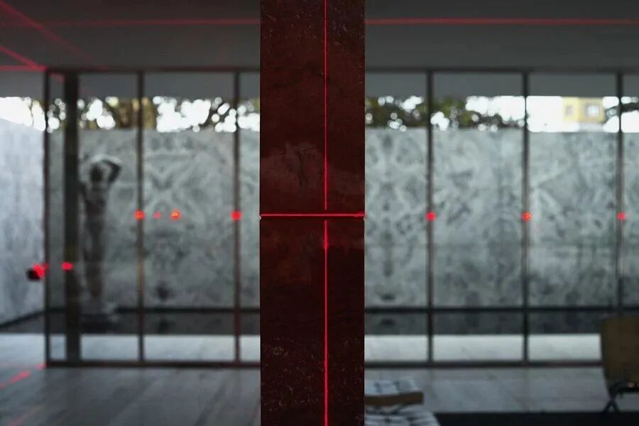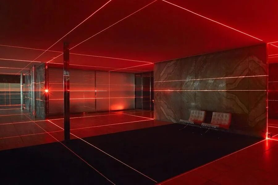 正如其名字所暗示的,“光的几何”利用激光网格来强调巴塞罗那展馆的直线形式和范·德·罗的经典建筑平面的公式化网格。从石灰地板到大理石墙壁,醒目的红色灯光照亮了每一个表面。当从远处观看时,激光的组合会产生令人印象深刻的透视效果。