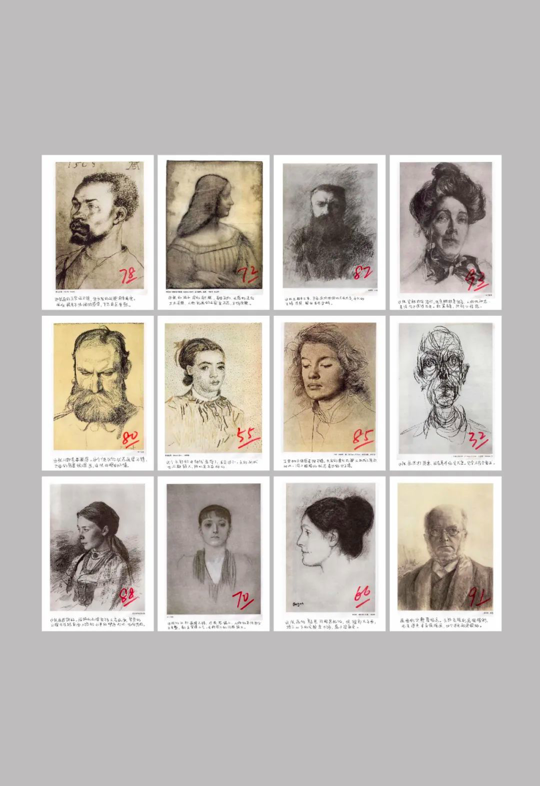 他们对一些大师(包括丢勒、达芬奇、罗丹、弗鲁贝尔、康勃夫、梵高、阿尼戈尼、贾科梅蒂、列宾、克利姆特、德加、门采尔)的肖像素描作品打分,并作简要点评。