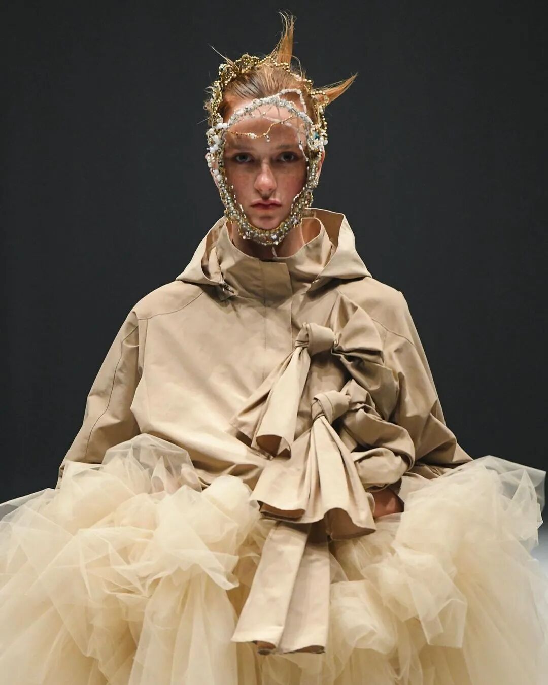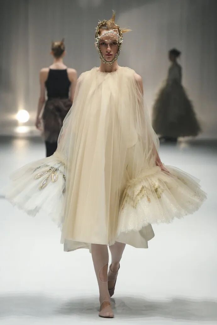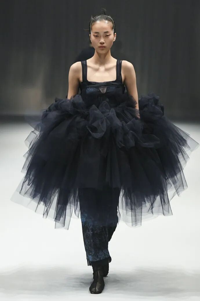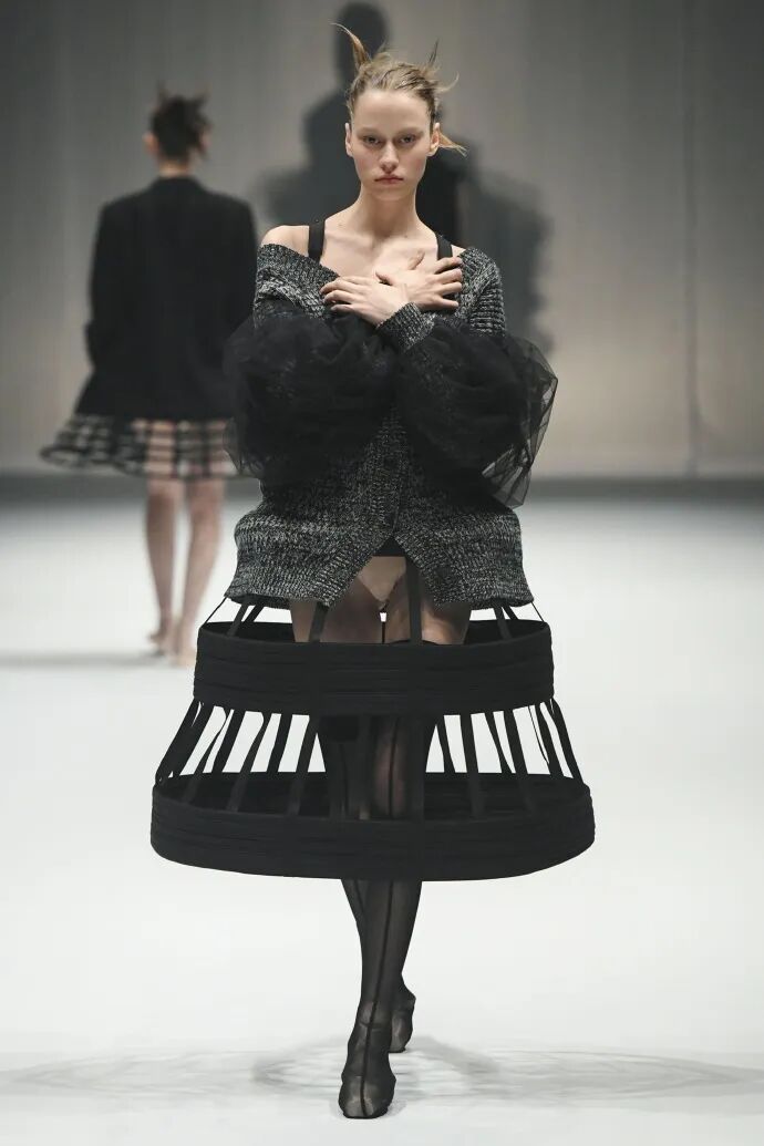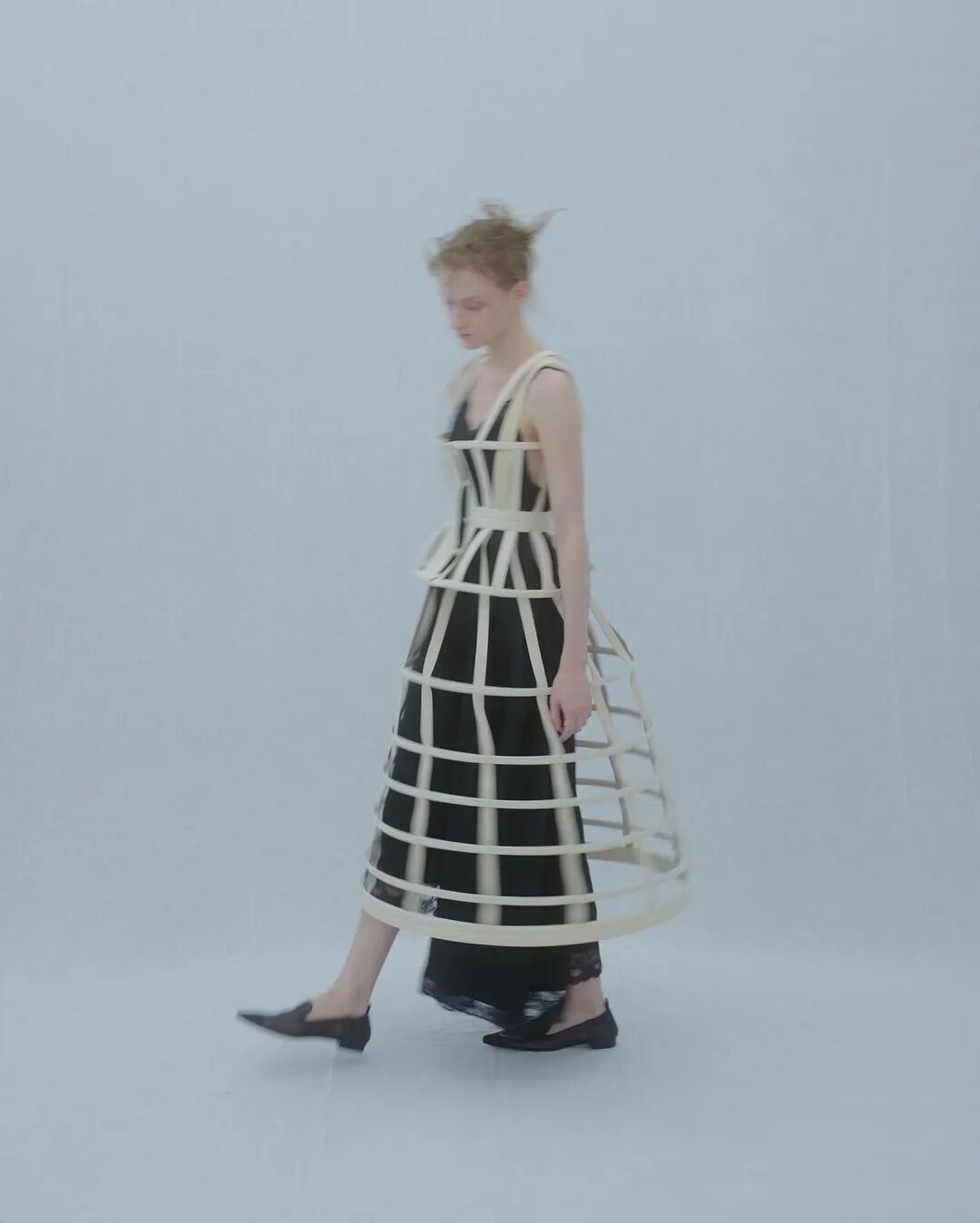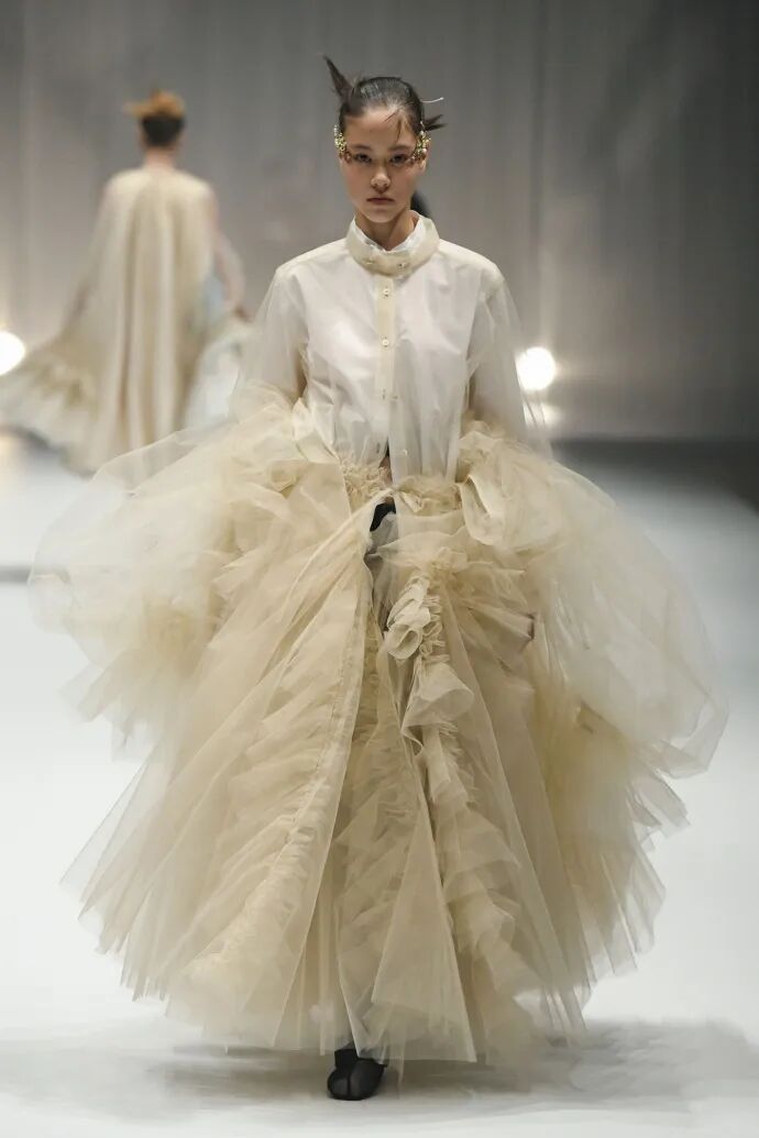 Chika Kisada23AW设计师捕捉”褪色的花朵“短暂之美,服装表面营造强大的约束感和控制力,大量薄纱的运用和开放的裙撑,则是她为了彰显女性动作时的身体律动感,捕捉瞬息转逝的流动美感的标志性设计。