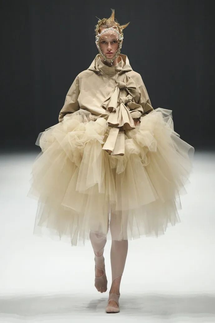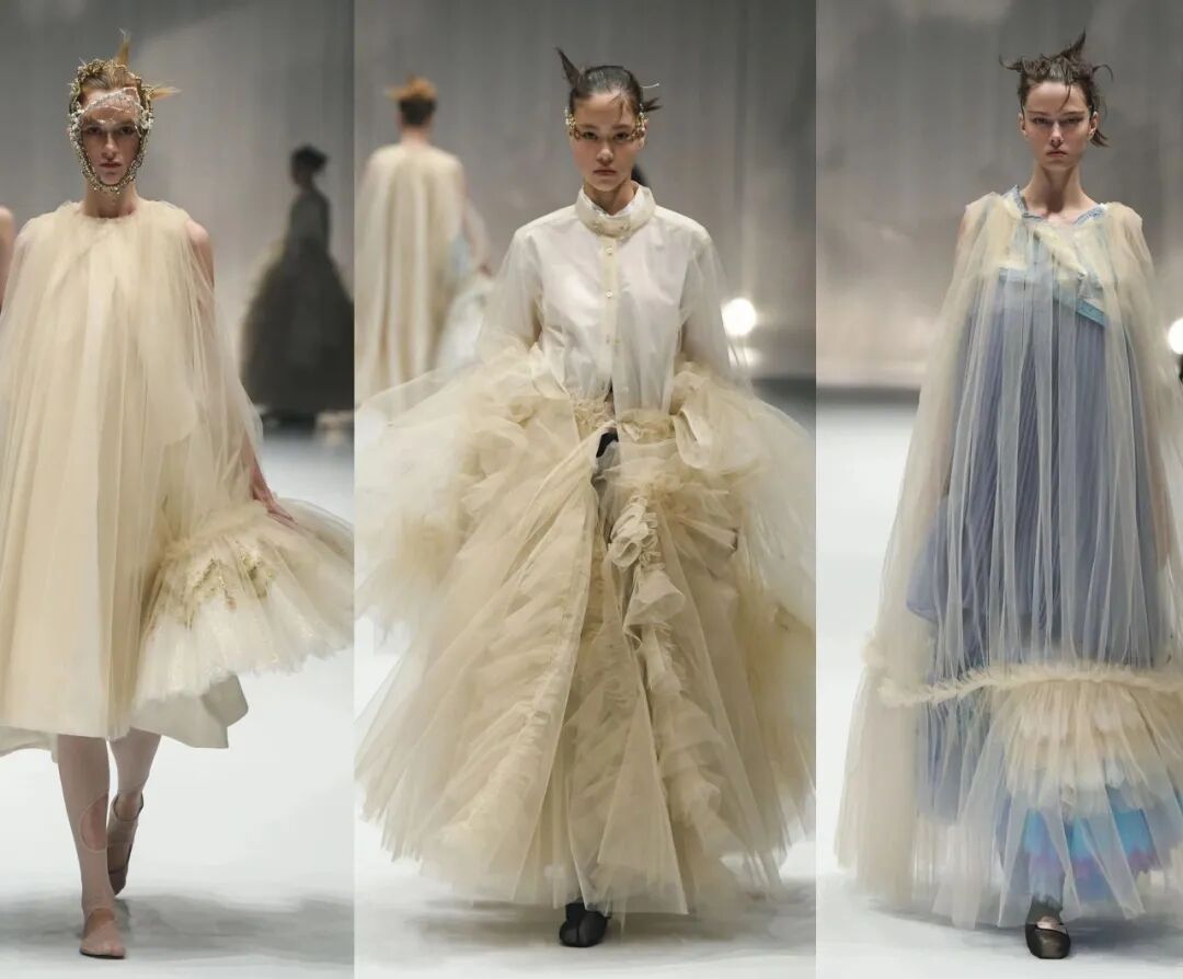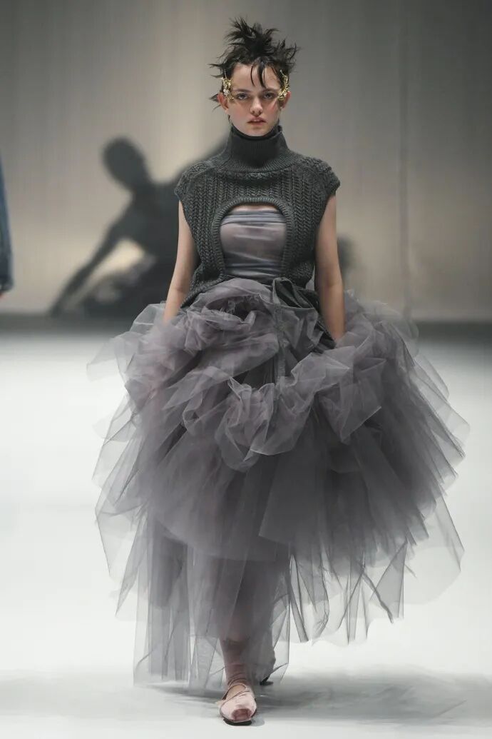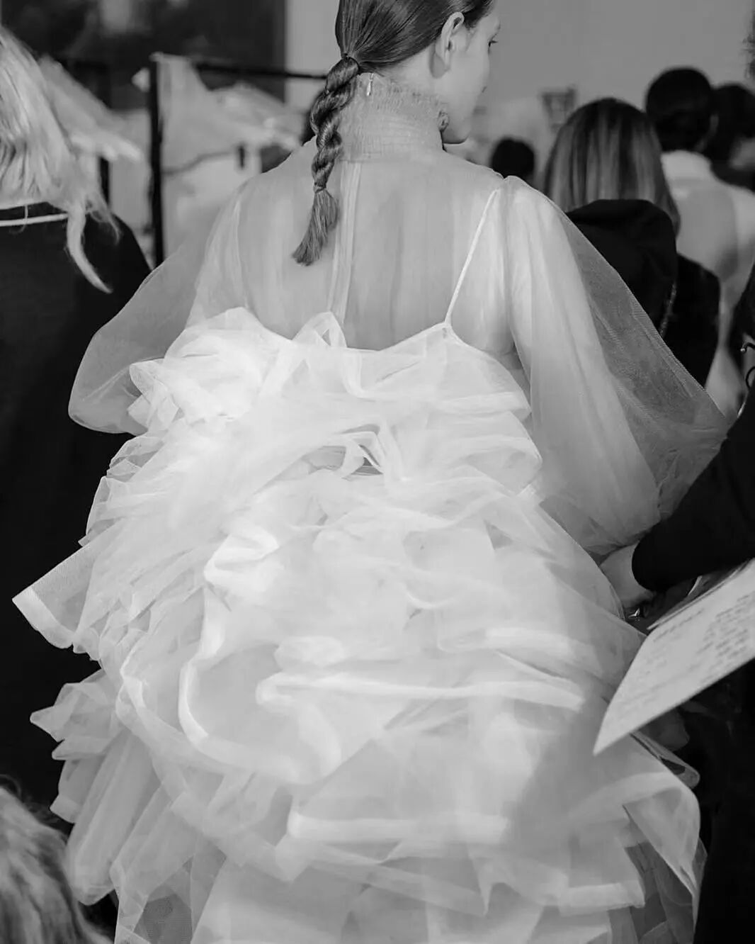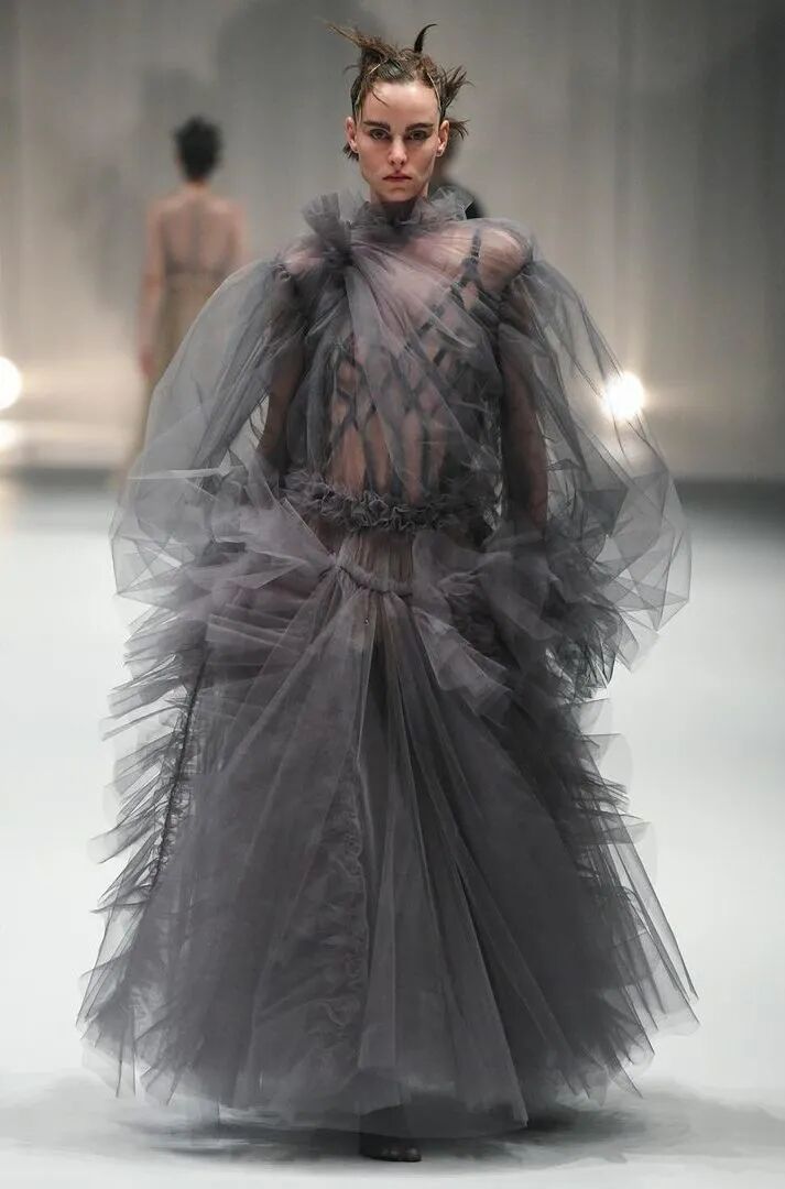 Chika Kisada23AW设计师捕捉”褪色的花朵“短暂之美,服装表面营造强大的约束感和控制力,大量薄纱的运用和开放的裙撑,则是她为了彰显女性动作时的身体律动感,捕捉瞬息转逝的流动美感的标志性设计。