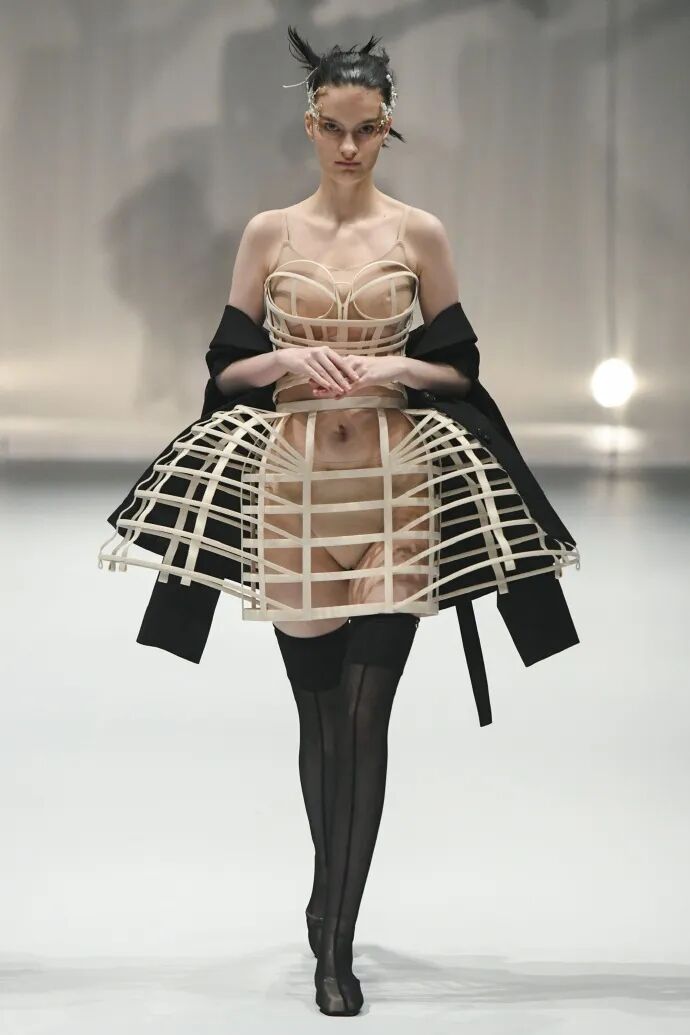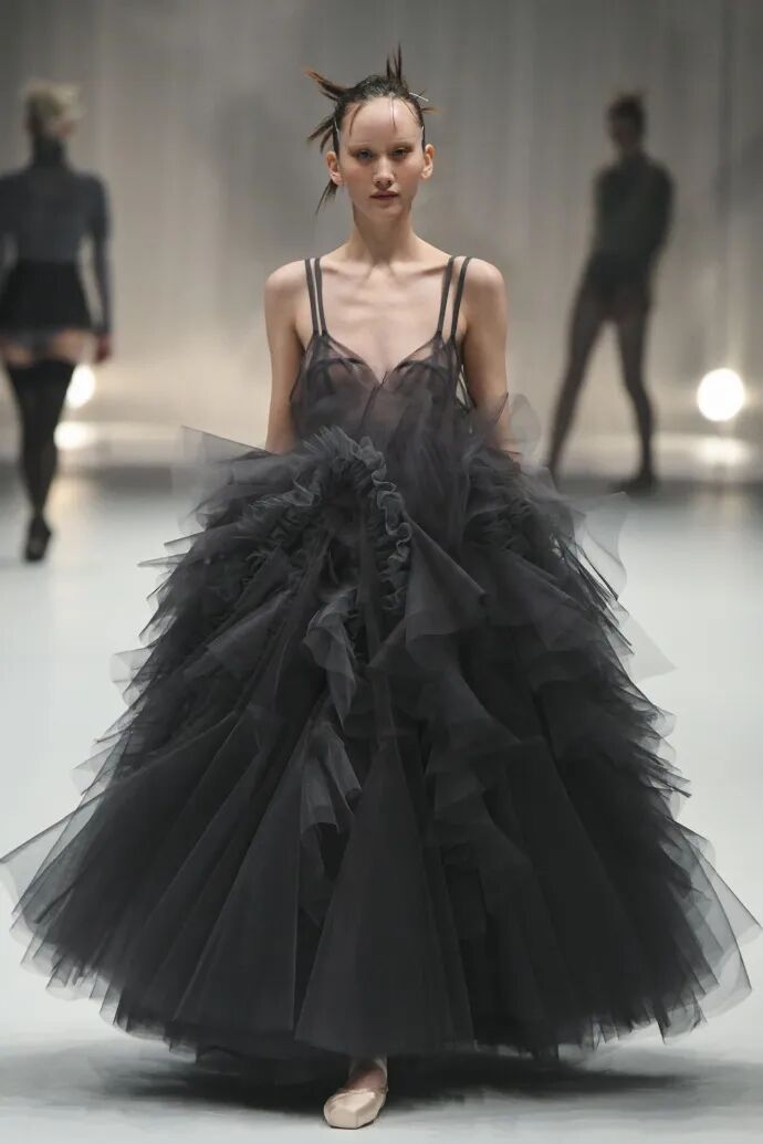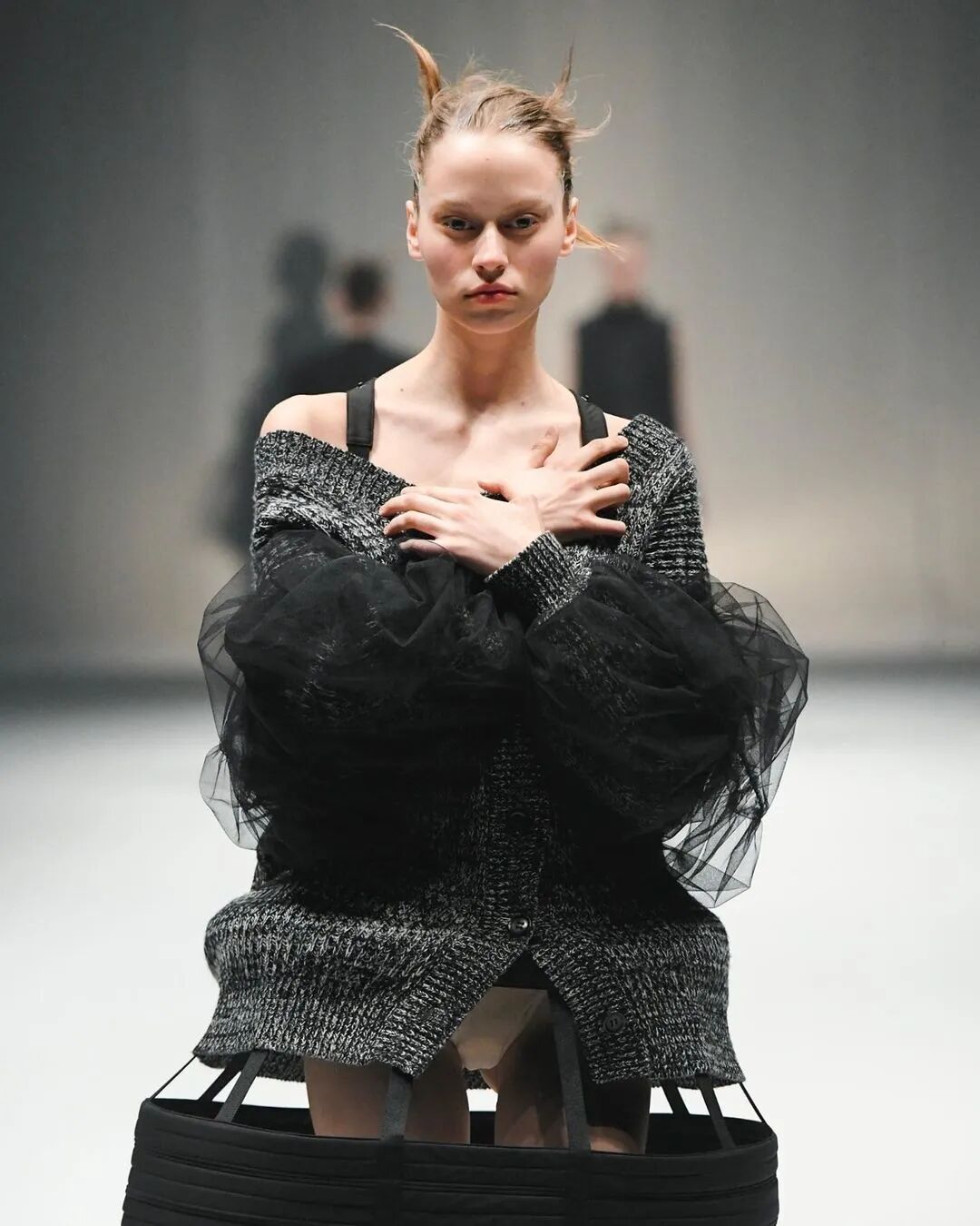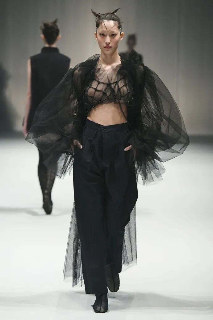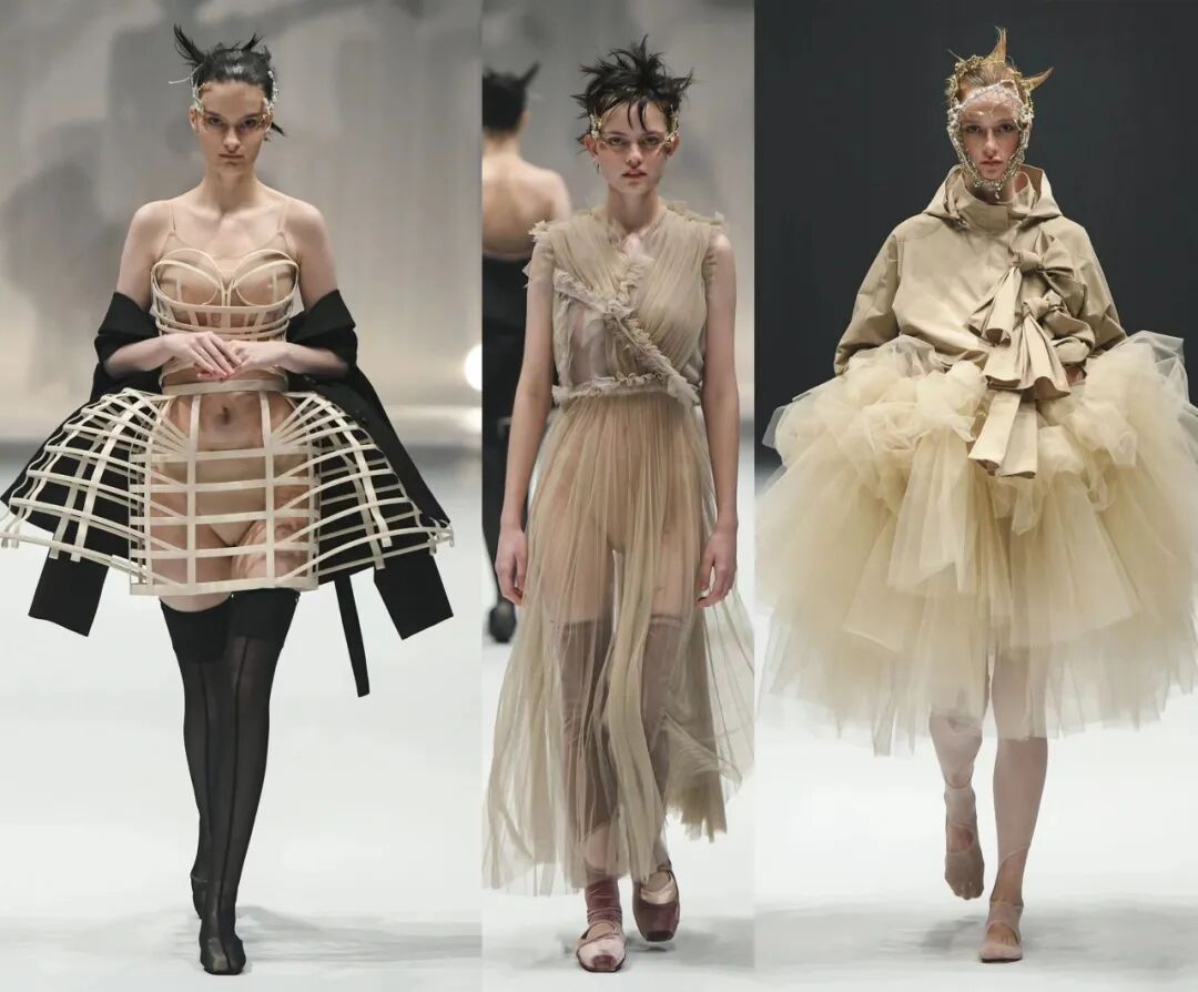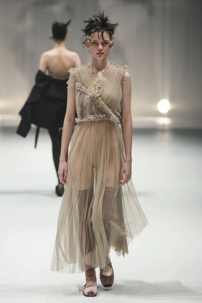 Chika Kisada23AW设计师捕捉”褪色的花朵“短暂之美,服装表面营造强大的约束感和控制力,大量薄纱的运用和开放的裙撑,则是她为了彰显女性动作时的身体律动感,捕捉瞬息转逝的流动美感的标志性设计。