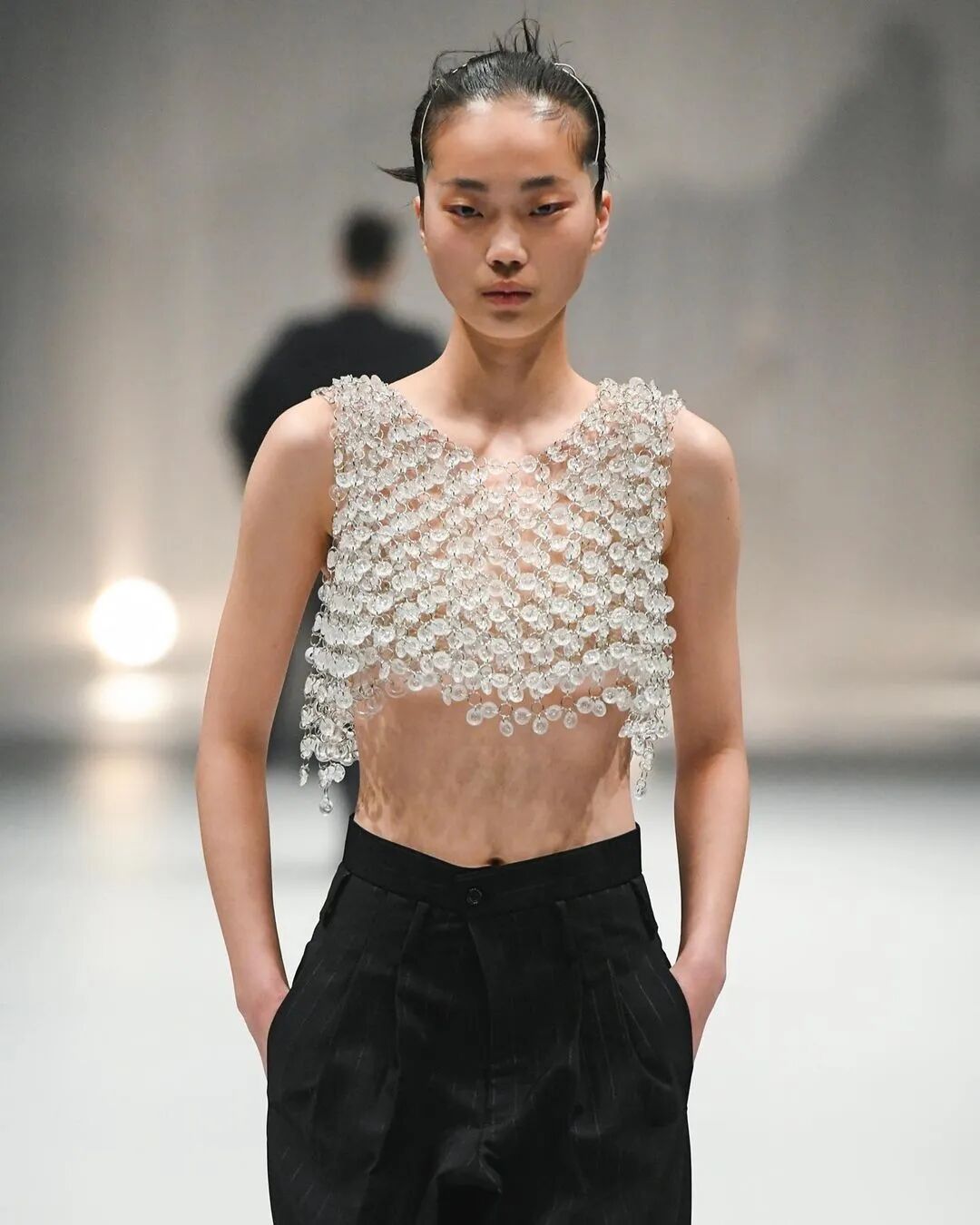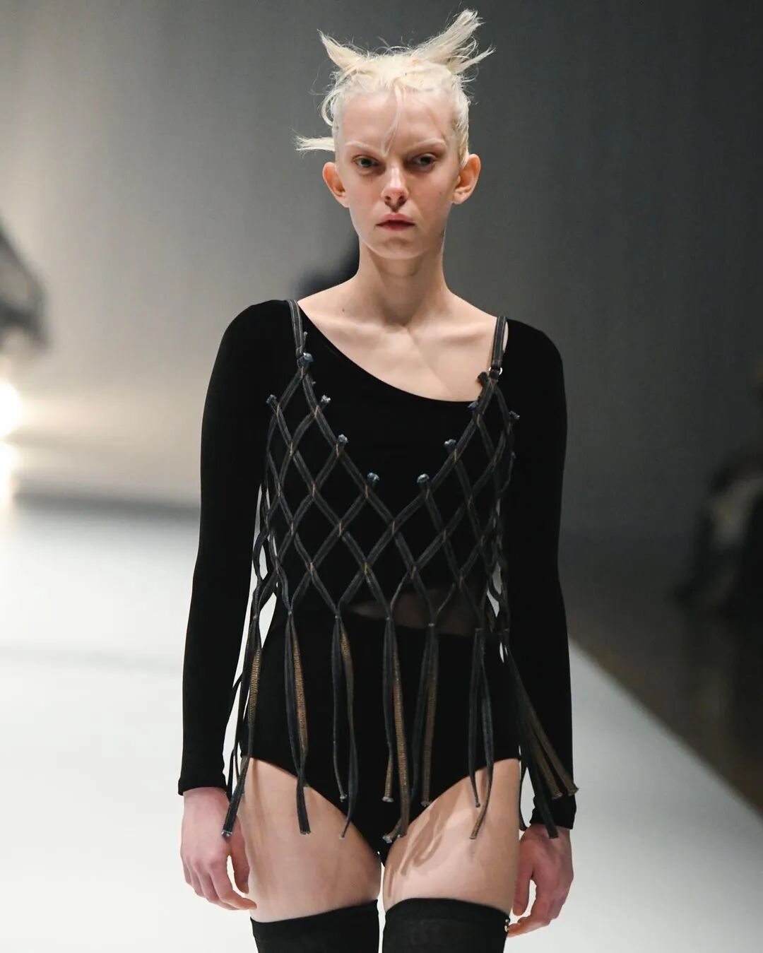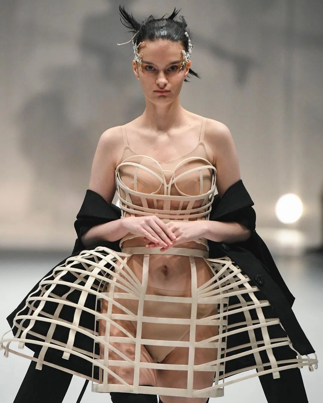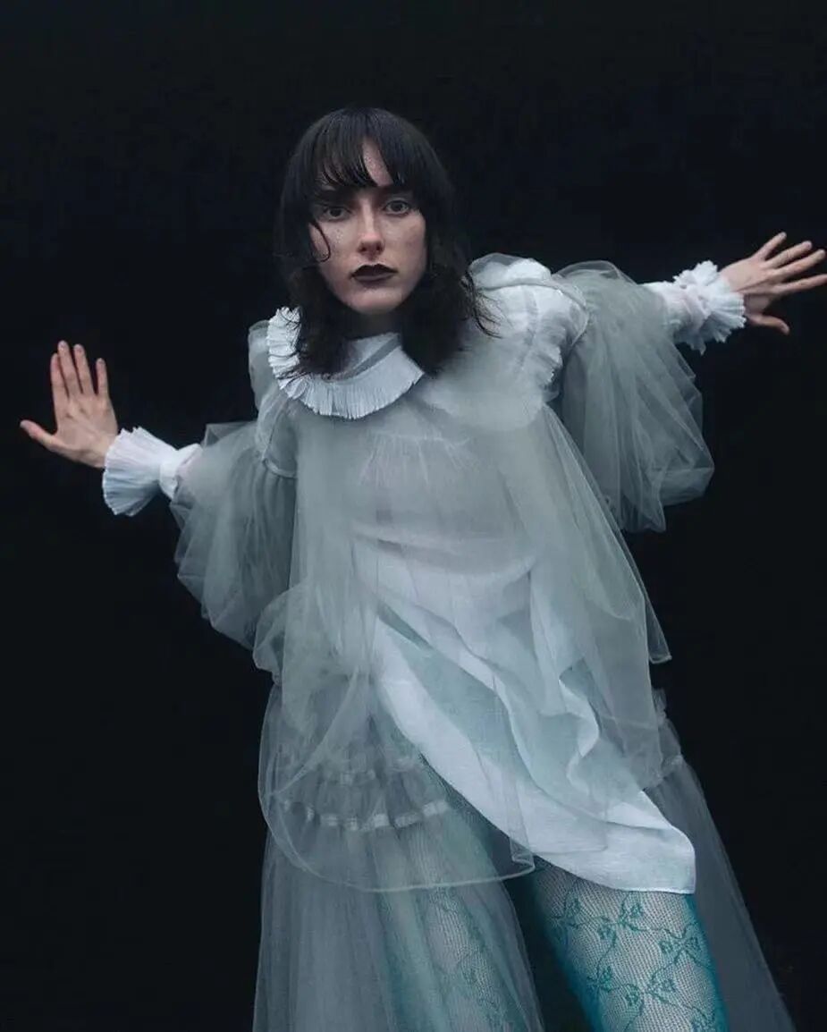 Chika Kisada23AW设计师捕捉”褪色的花朵“短暂之美,服装表面营造强大的约束感和控制力,大量薄纱的运用和开放的裙撑,则是她为了彰显女性动作时的身体律动感,捕捉瞬息转逝的流动美感的标志性设计。