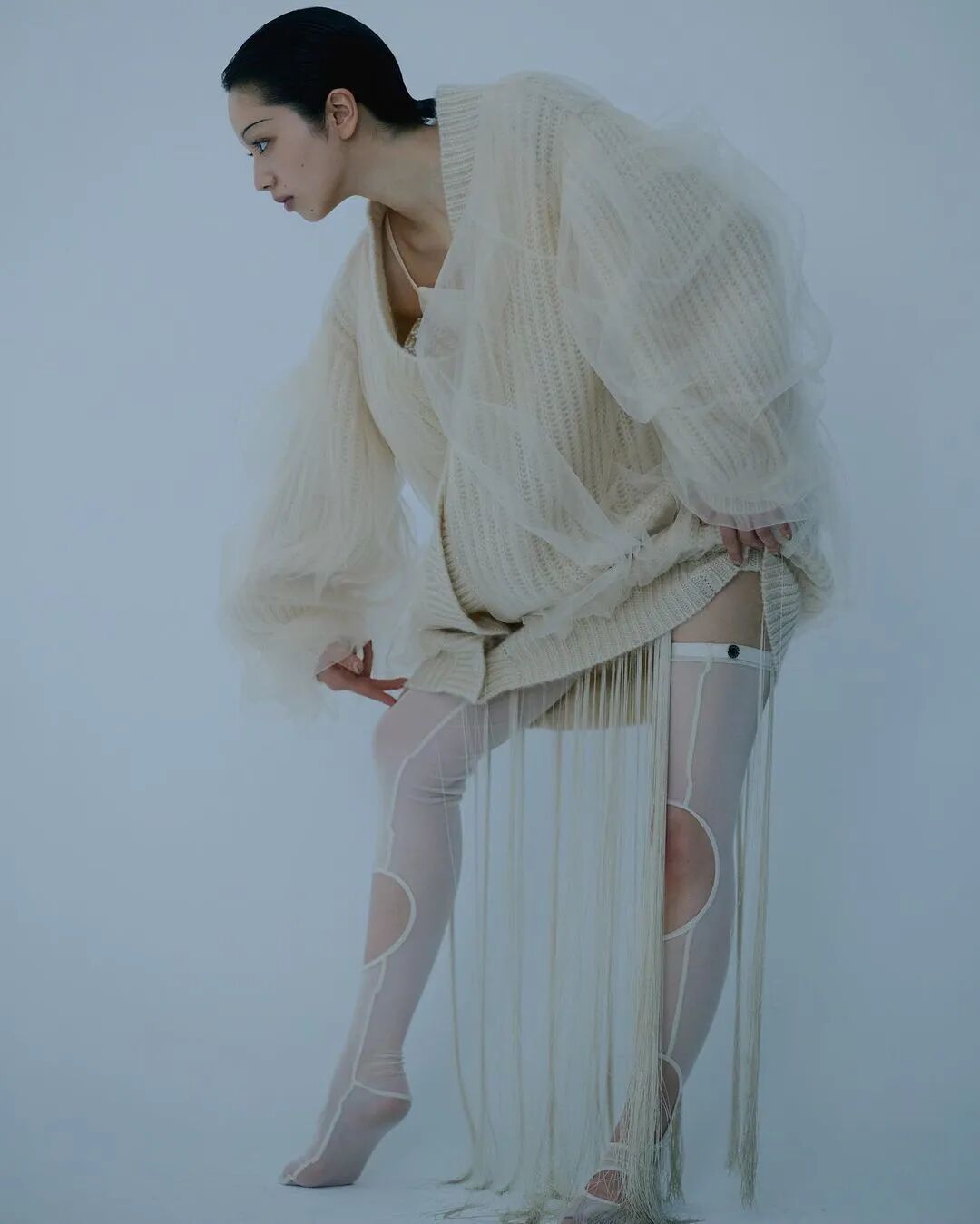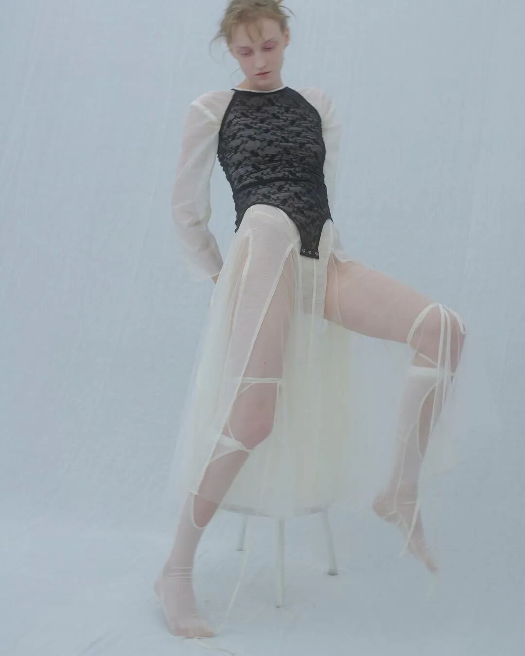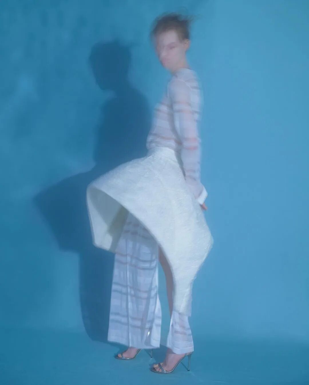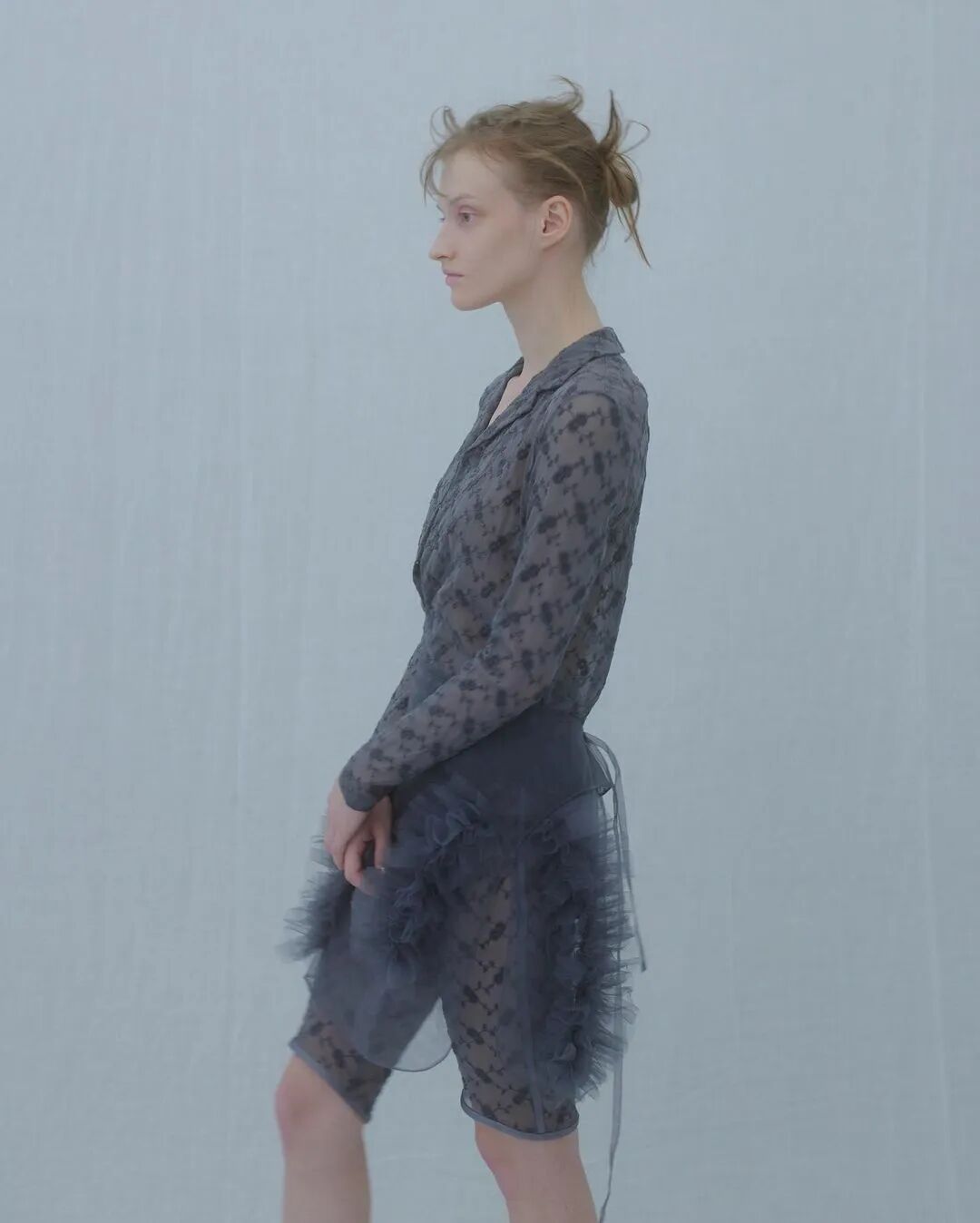 Chika Kisada2023春夏系列”装饰品“,设计师探讨现实与幻想之间的故事,你会看到苍白的色调,温柔的影子和精细的技巧。 Kisada从舞蹈动作中获得灵感,表达一种精神与肉体,织物与身体微妙、诗意的感觉。