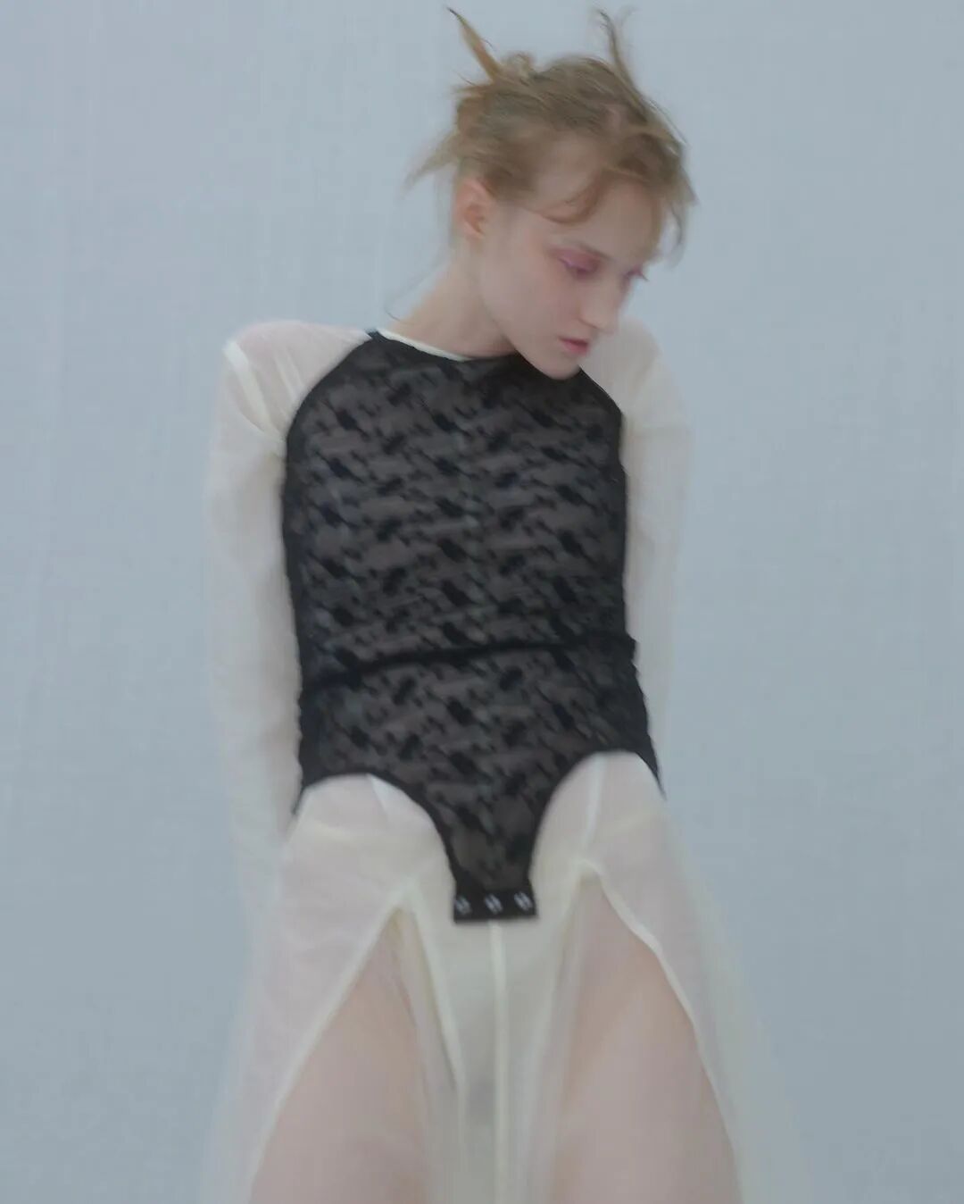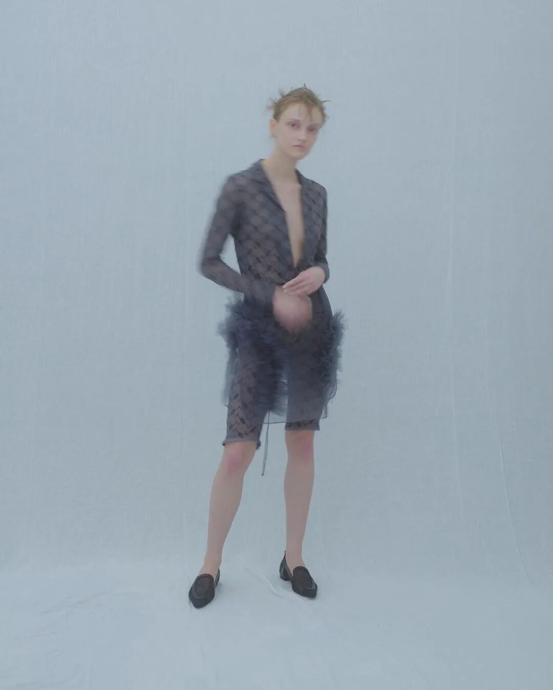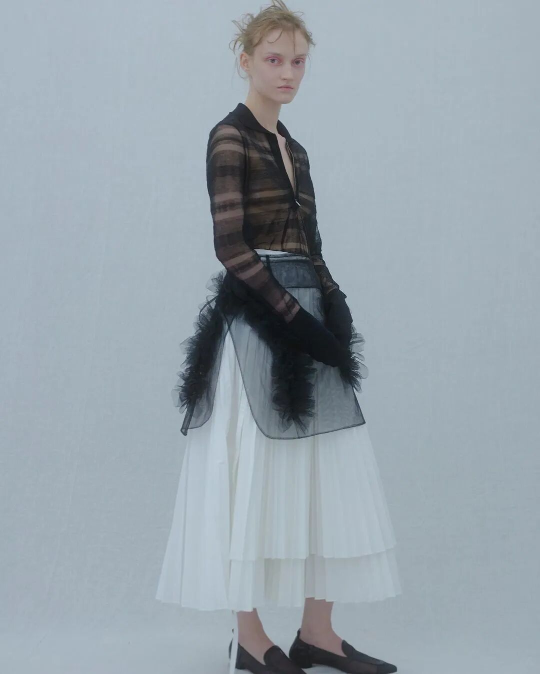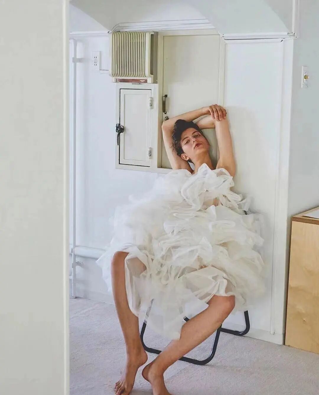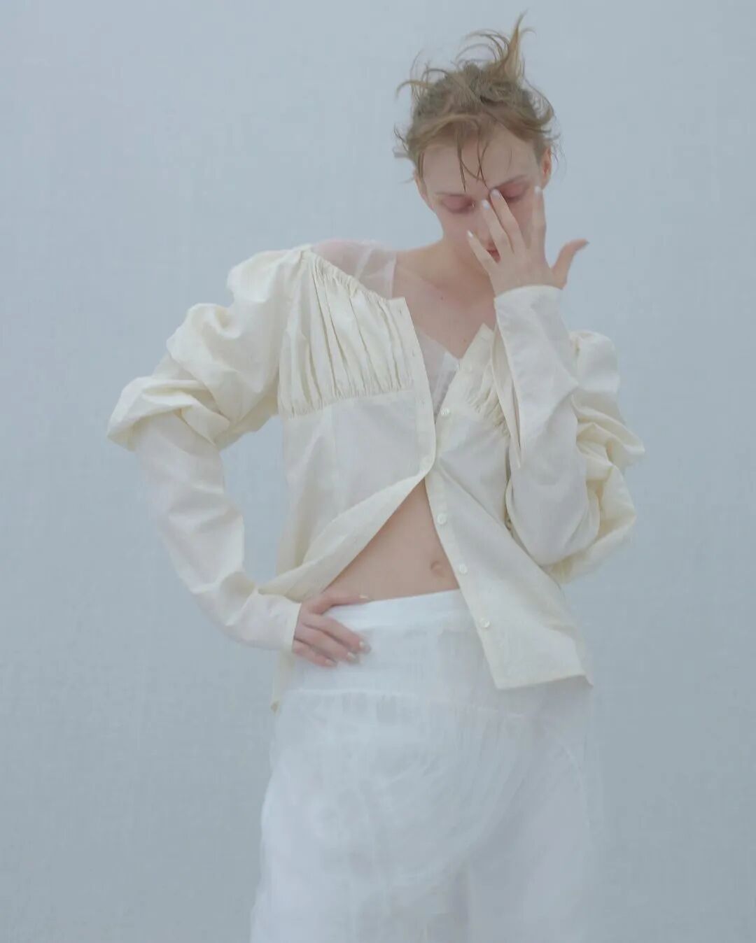 Chika Kisada2023春夏系列”装饰品“,设计师探讨现实与幻想之间的故事,你会看到苍白的色调,温柔的影子和精细的技巧。 Kisada从舞蹈动作中获得灵感,表达一种精神与肉体,织物与身体微妙、诗意的感觉。