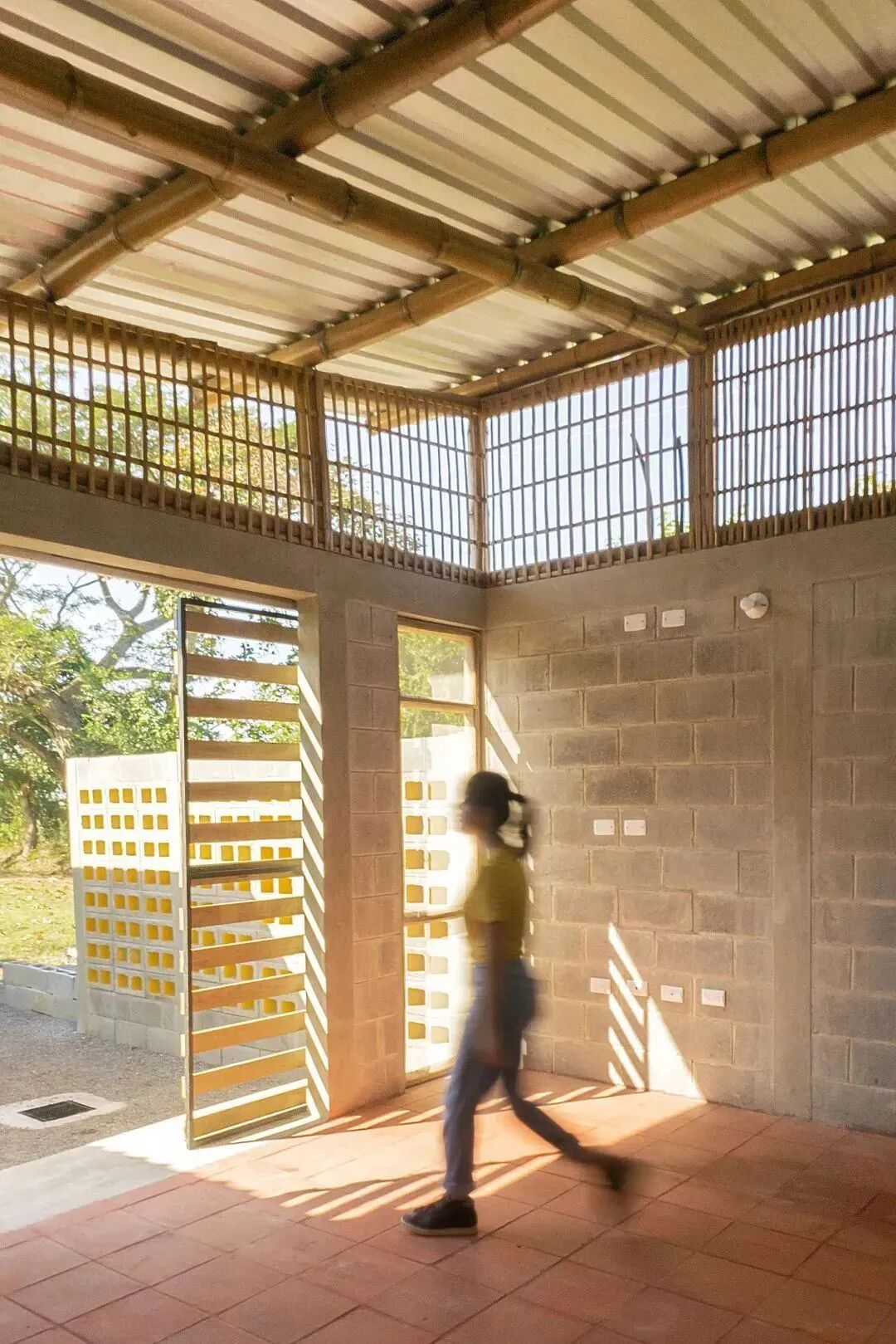 这栋建筑最吸引人的是一个接一个的黄色小格子。这些由特制混凝土砌成的格网让整个建筑通透起来,自然风穿过空间,带给受灾的人们一些温柔的安抚。