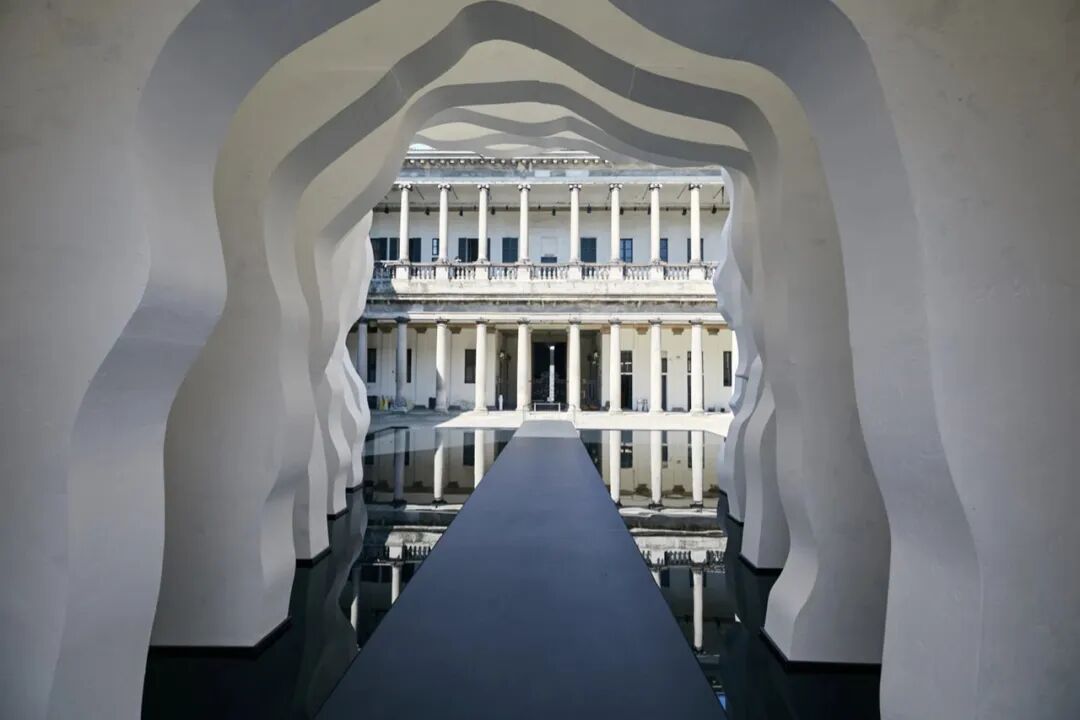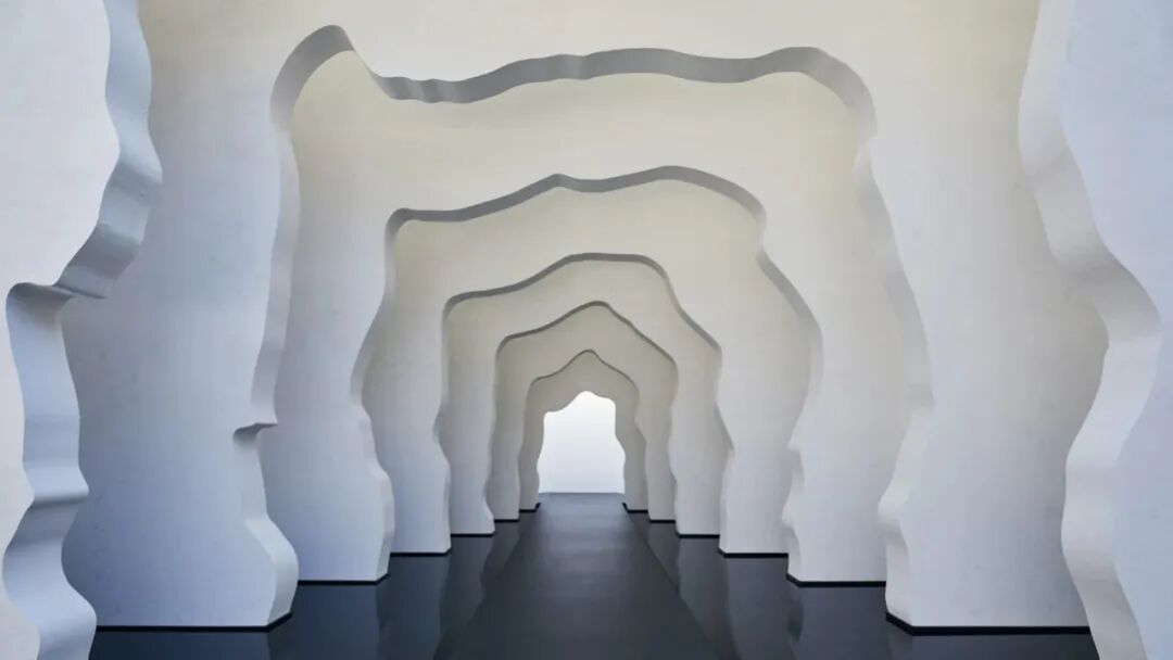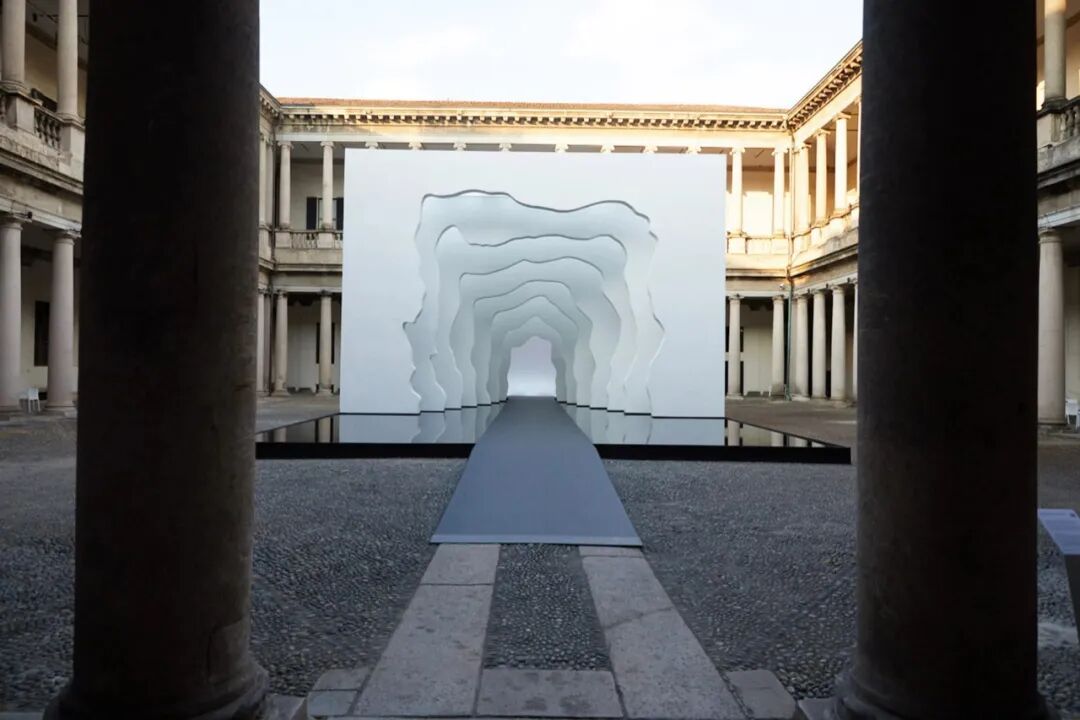 该装置取名为为“分层”(Divided Layers),由七个堆叠的白色面板组成,这些面板排列成一条隧道,可通过两侧有水景的平台进入。“这是一个非常现代、干净的白色盒子,像是被挖掘出来,并通过这些多层进行了切割。”