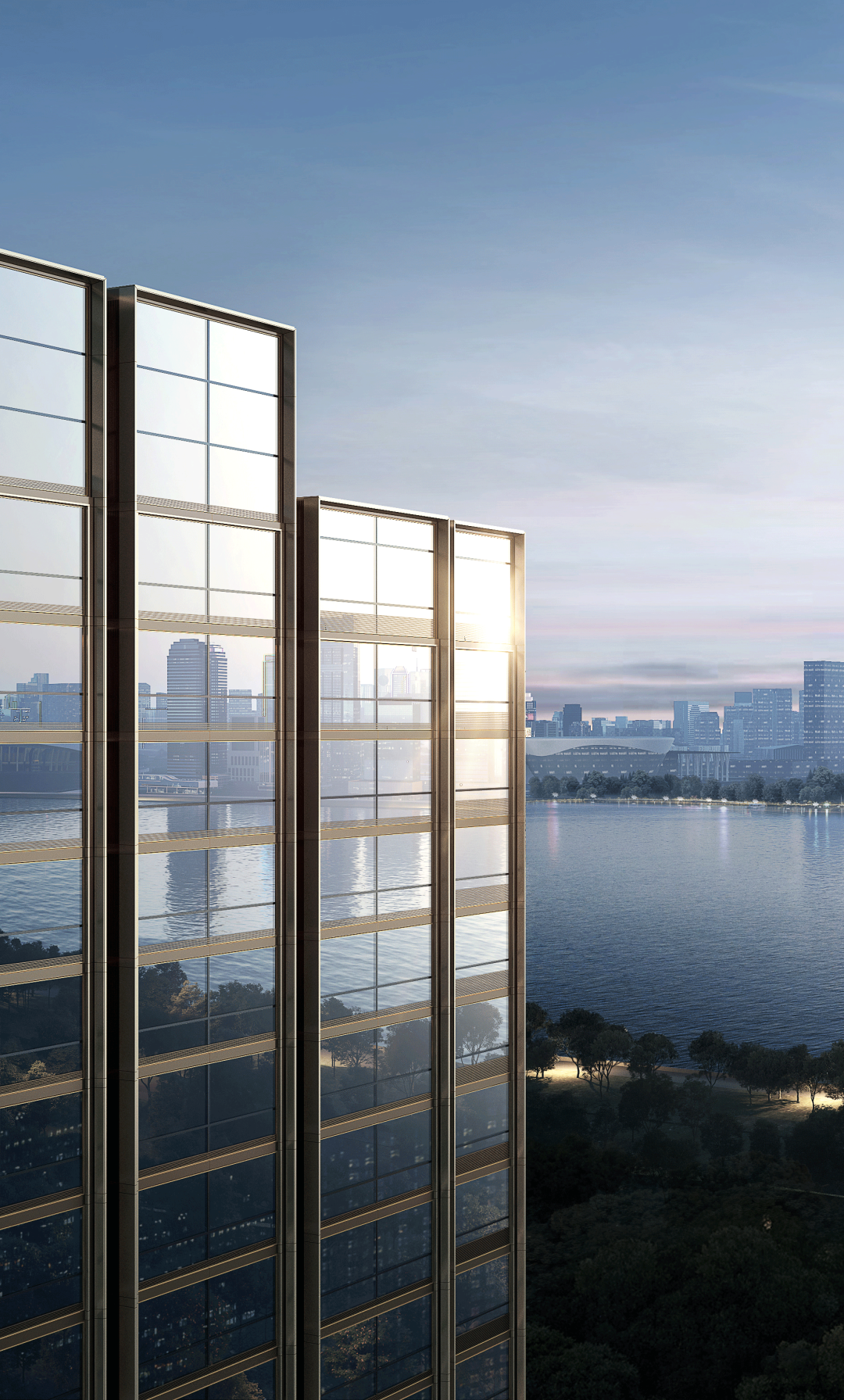 “项目很特殊,正面没有一个开启扇。”这是塑造纯净的手法,也是建筑的艺术美学。面江正面的窗像一个个框景,框住了四时流传,也框住了天际线。开启扇都在侧面呈现,以保证建筑的利落纯粹,以及缔造前所未有的奢华。