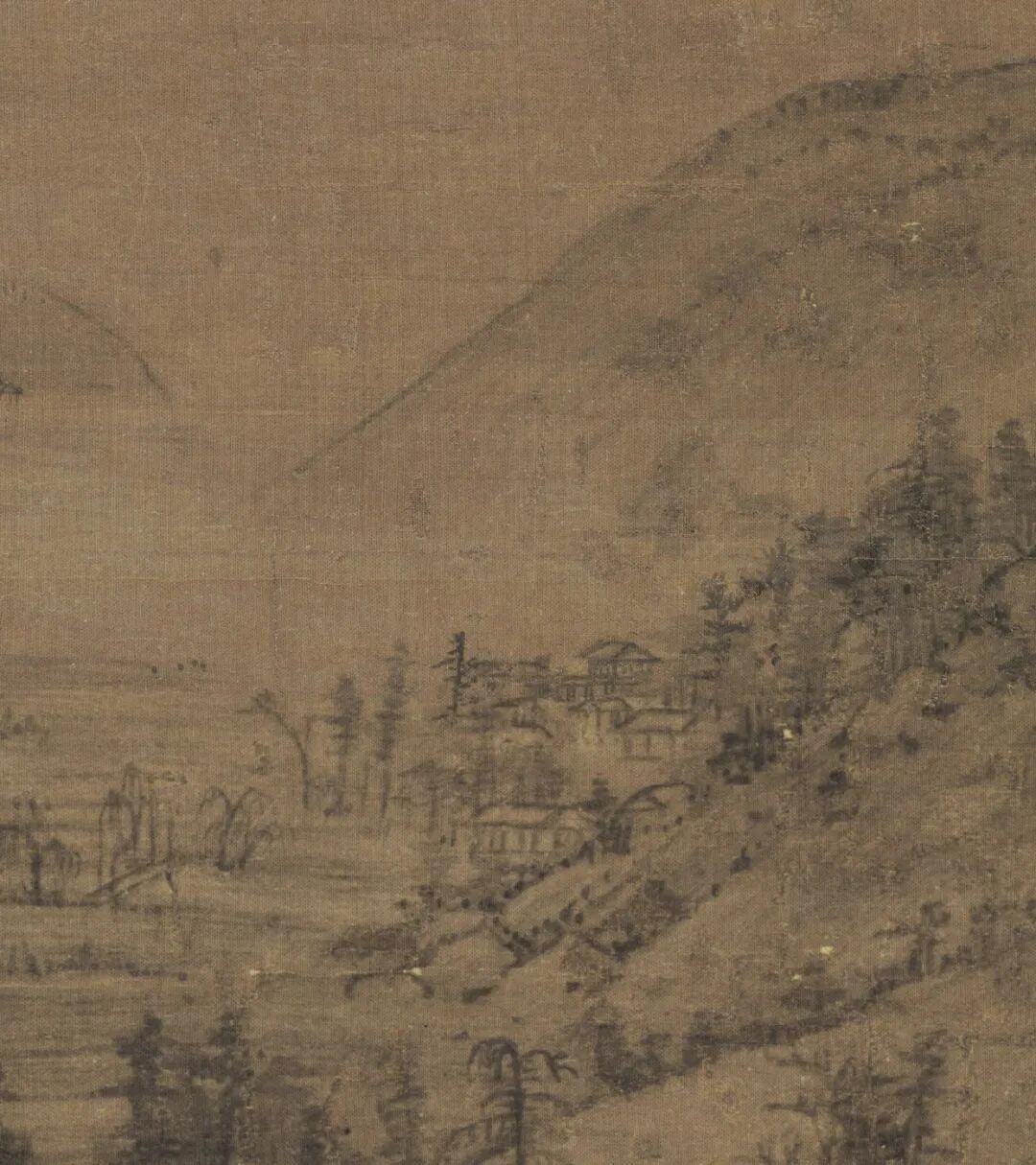 村舍之后,仿佛有个大型湖泊铺展到无限深处,没有画出水湾,只以渐变色模糊着湖水与雾霭、山峦、沃野的分界。“山水中唯水口最难画。远水无湾,远人无目。”(《写山水诀》)他解决了自己提出的问题。