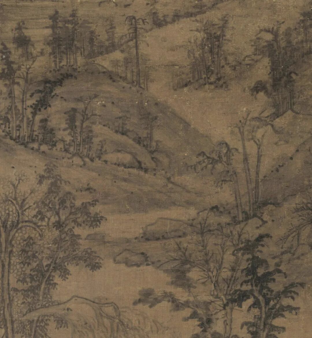 视线往上抬升,视野越来越开阔,物象逐渐分出明确的层次,原本水润的淡墨,墨色更淡了下去,前景溪谷醒目,而高山渐渐隐于雾霭。在黄公望笔下,淡墨罩染山体,源自五代董源的“披麻皴”线条自上拉下直顺畅通。山体“植被覆盖率”似乎不高,但山体任何一个局部都有丰富的明暗关系,淡皴山石,辅以点苔,疏密得当,尤其是一簇簇树木的画法细腻丰富,使得山体生动朗润。甚至山体的陡然直下,也因这种生动朗润也不让人觉得剧烈了。同时,以横向笔法点就的亭亭枝叶,也减缓了这种“剧烈”。山脊线只绘出一部分,很快从右上方延展到了画外,供你想象整条山脉的丰富生态。