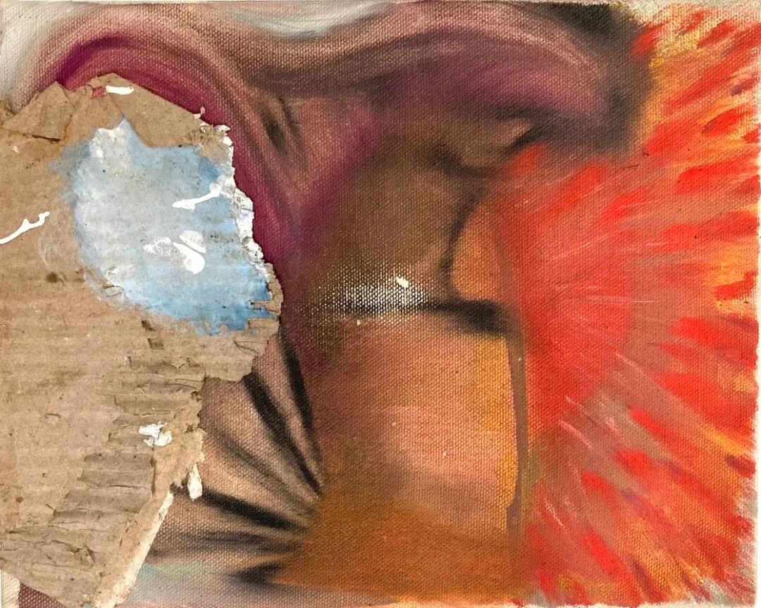 “无题(法兰)”,2020 年,油画、干颜料、丙烯酸、蜡笔、新闻纸,安装在面板上 11" x 7.5"