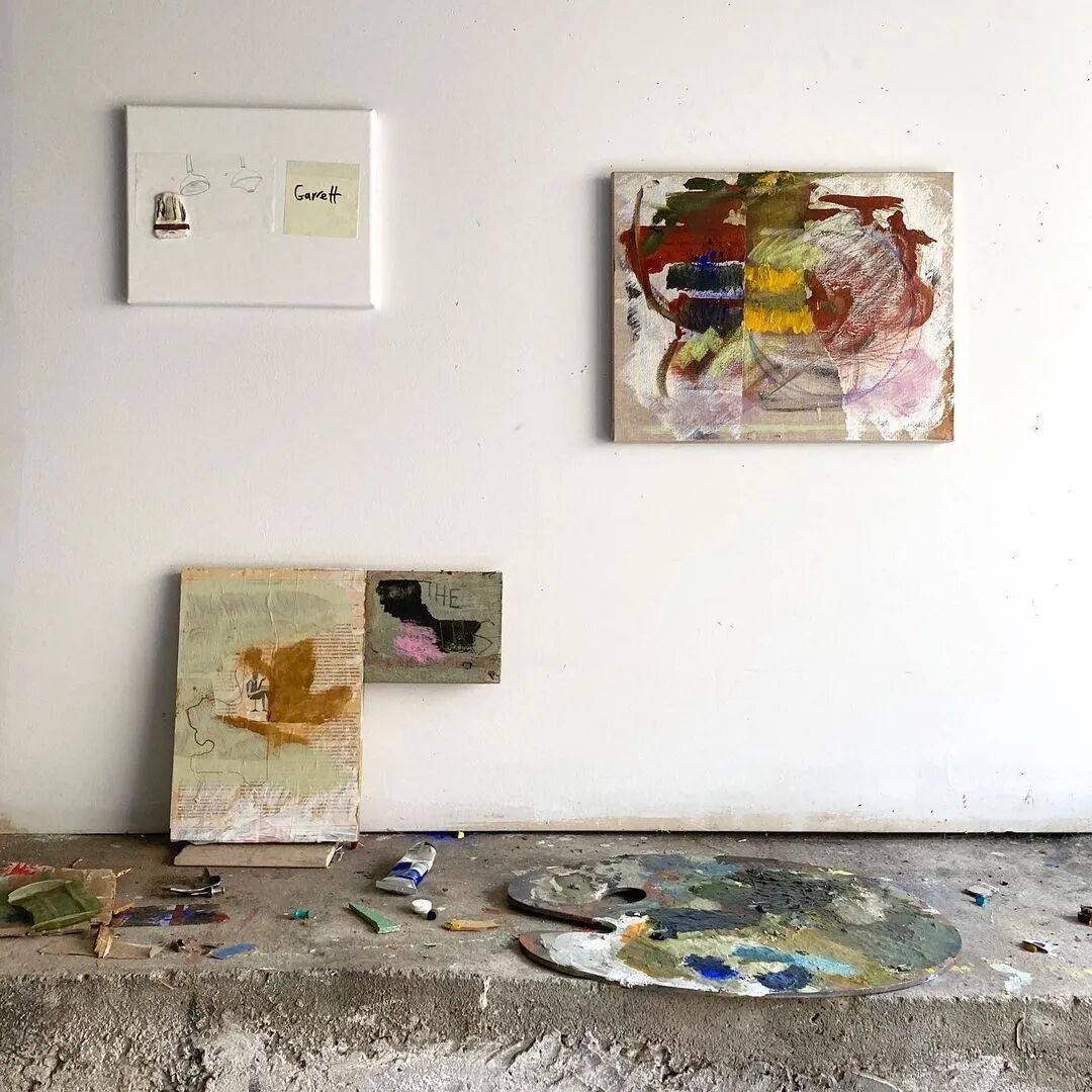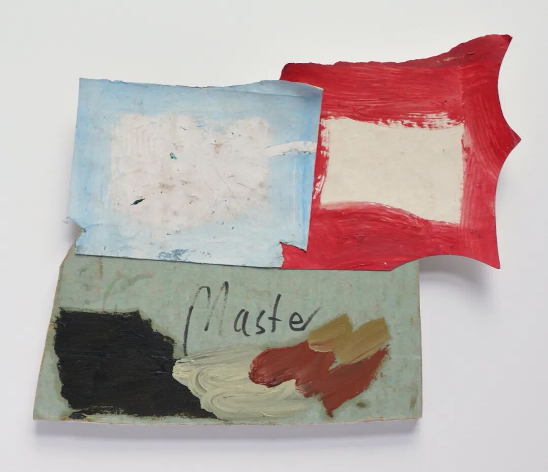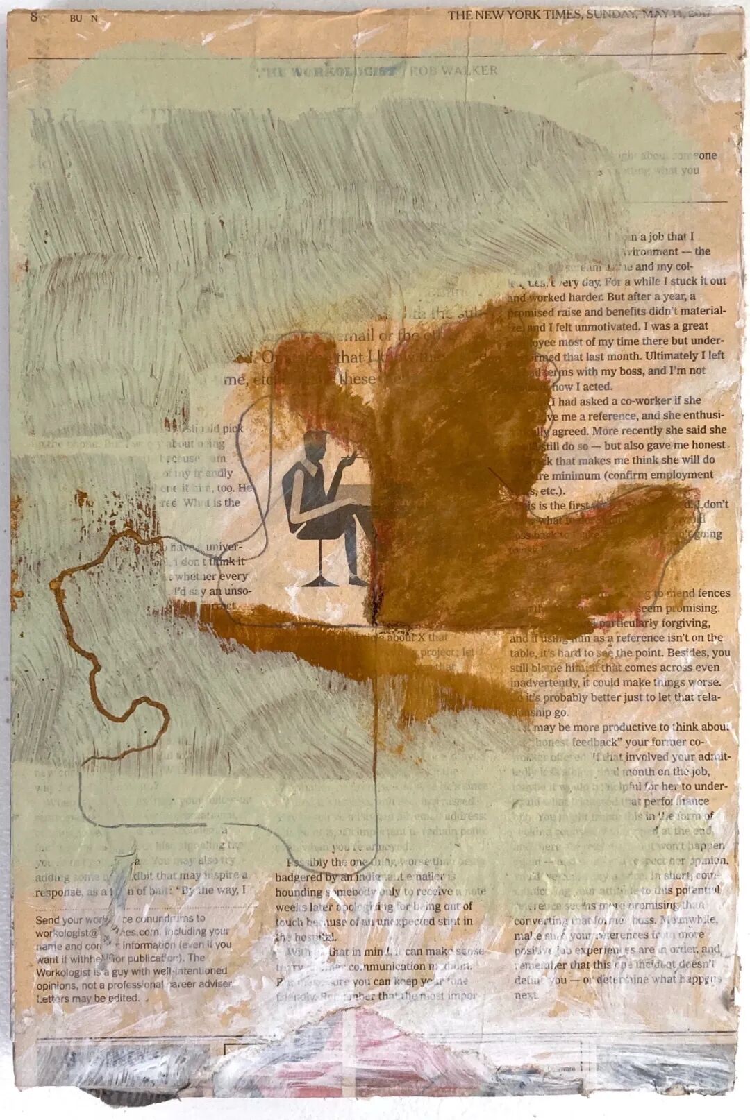 “大师”,2019 年,油、蜡、石膏板和发现的文字,纸上水彩 8 英寸 x 10 英寸