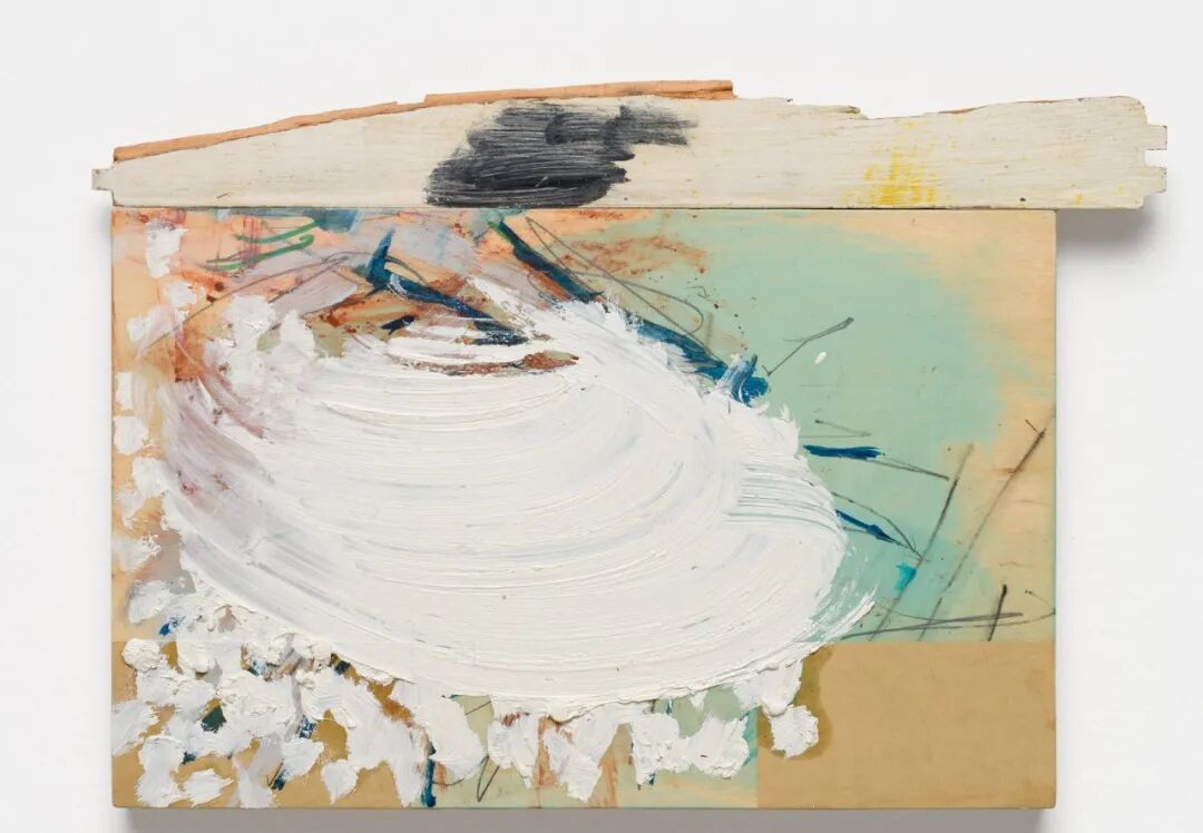 无题(诺兰的翼尖),2021 年,布面油画、蜡、金属和拼贴画,24 × 34 × 2 厘米