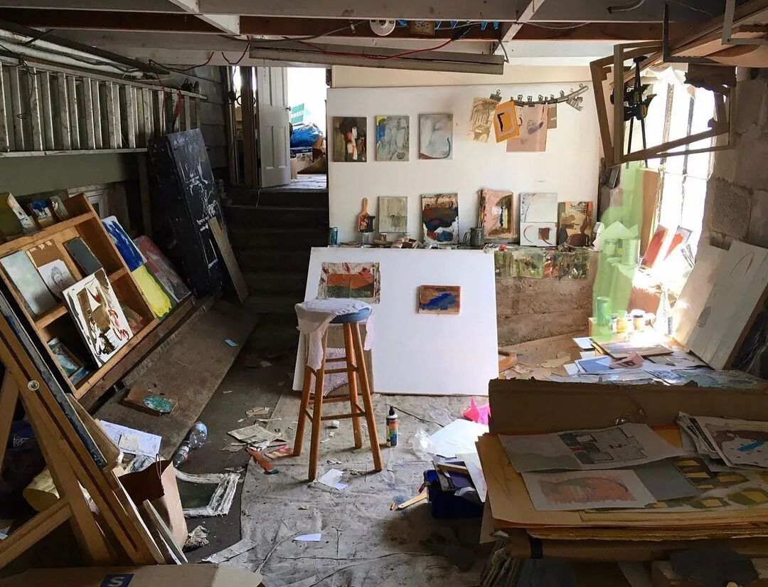 “谷仓”,2017 年油画、蜡和拼贴画,面板 11" x 14"